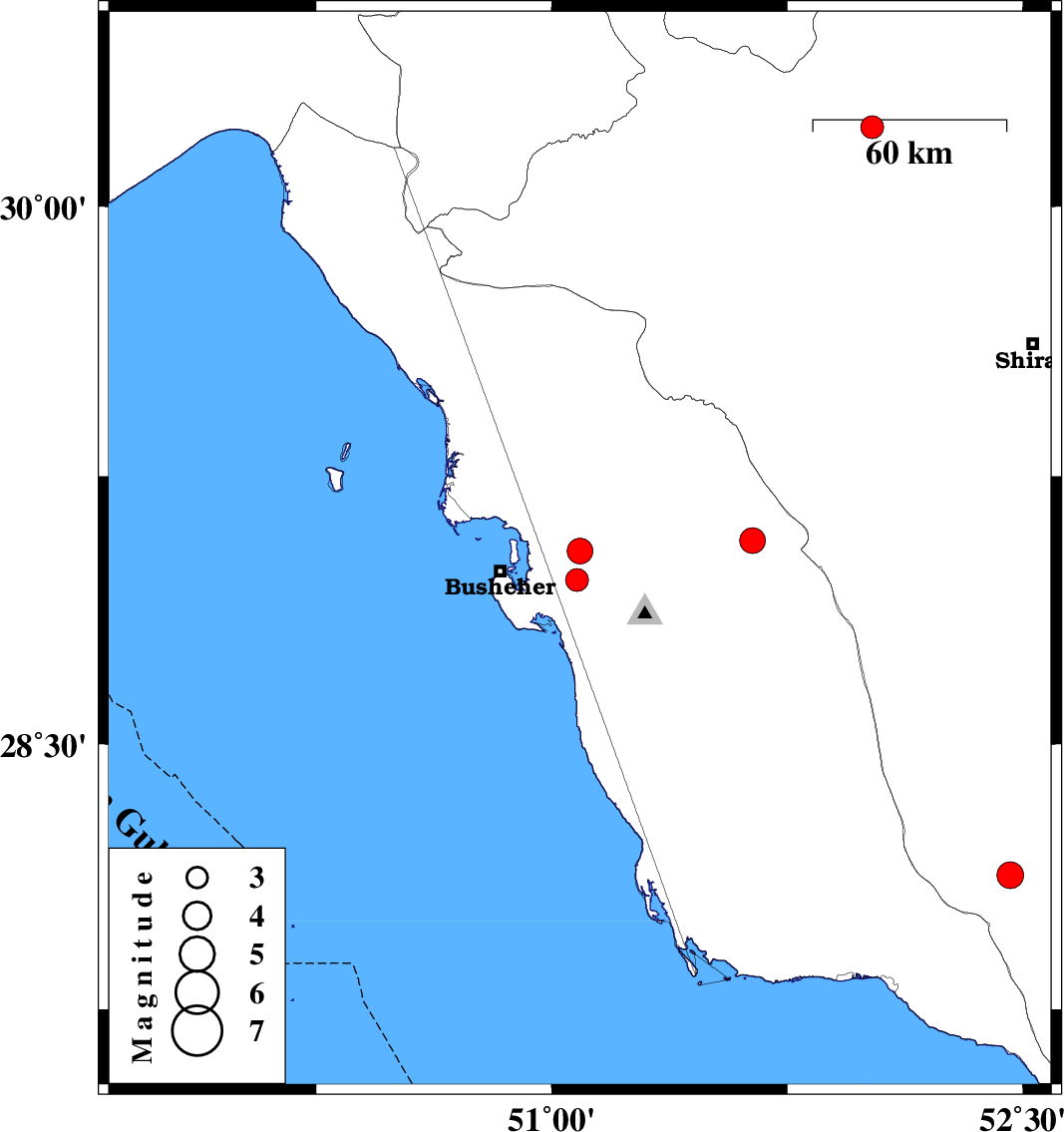 | 2012/01/25 | 11:14:06.2 | 14:44:06.2 | 28.96 | 51.08 | 17 | ML:3.3 | Bushehr Province, 20 km West of Ahram | ||
