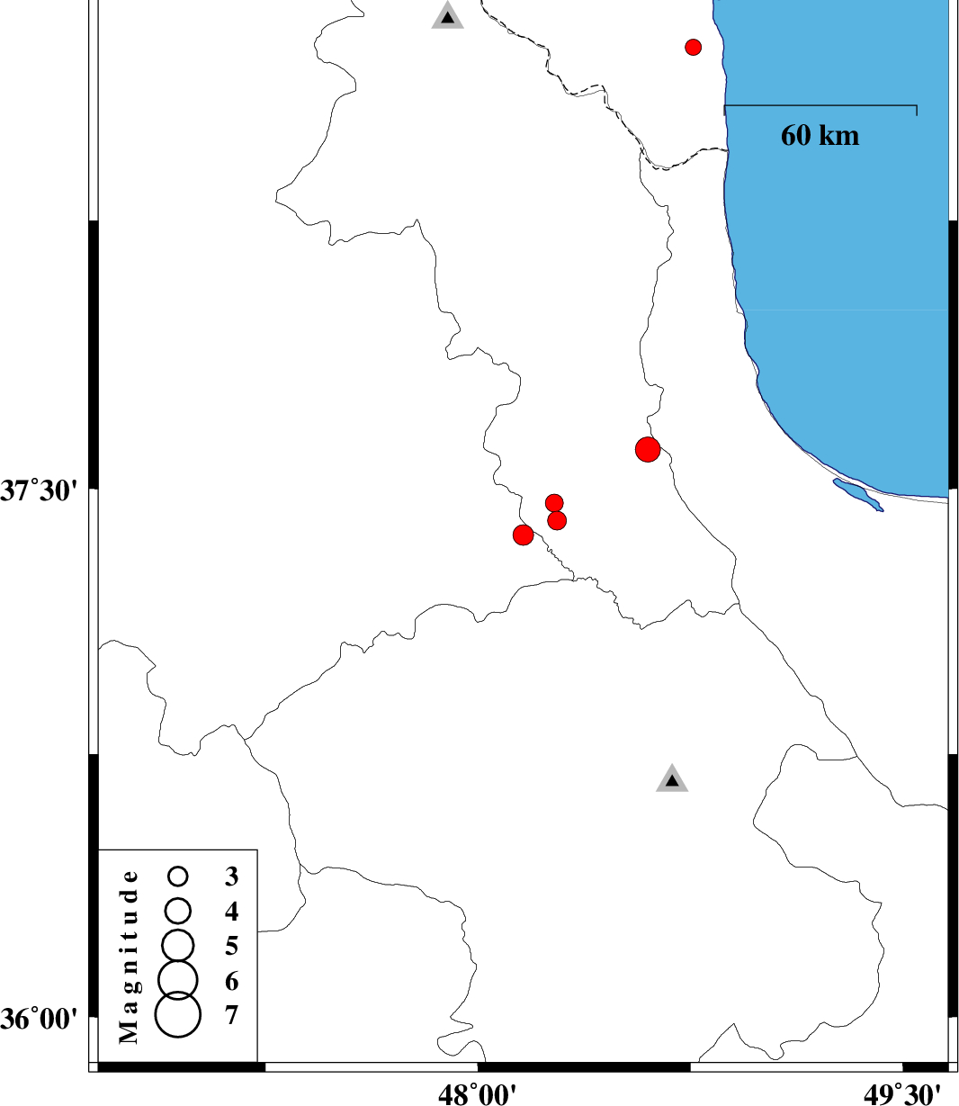 | 2012/02/03 | 13:02:46.5 | 16:32:46.5 | 37.41 | 48.28 | 14 | ML:2.9 | Ardebil Province, 33 km South-West of Givi | ||