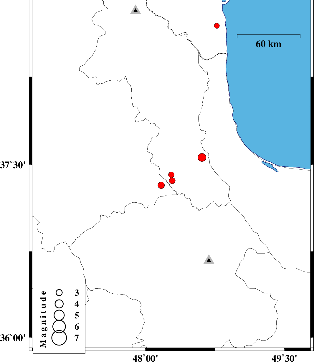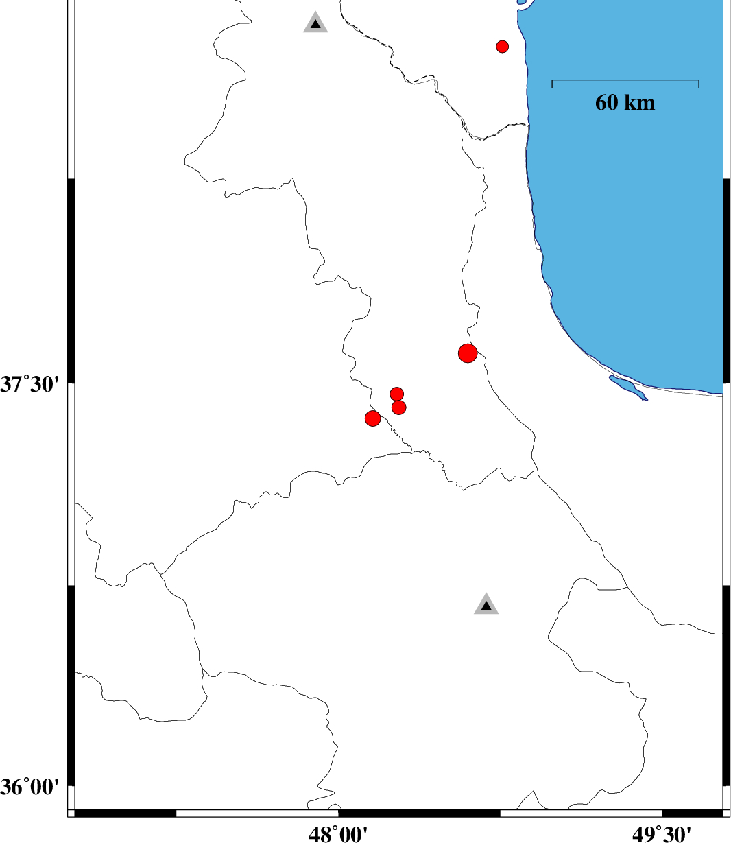 | 2012/02/03 | 13:02:46.5 | 16:32:46.5 | 37.41 | 48.28 | 14 | ML:2.9 | Ardebil Province, 33 km South-West of Givi | ||