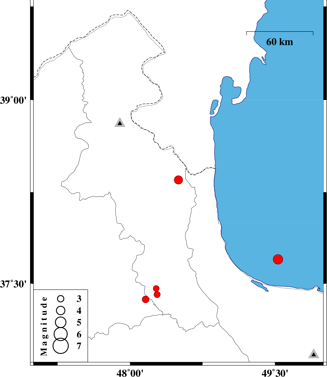 | 2012/02/04 | 20:04:14.0 | 23:34:14.0 | 37.7 | 49.53 | 40 | ML:4.5 | Caspian Sea, 26 km North of Bandar-e anzali | ||