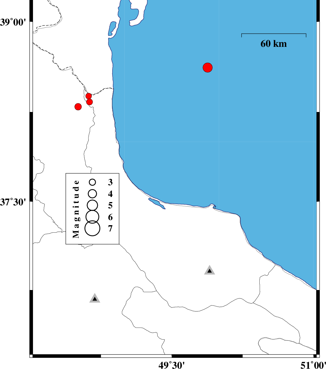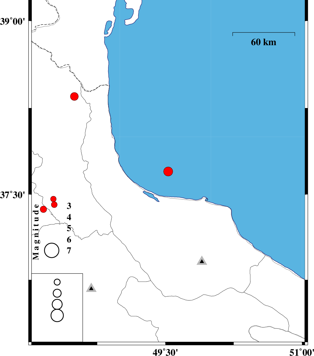 | 2012/02/04 | 20:04:14.0 | 23:34:14.0 | 37.7 | 49.53 | 40 | ML:4.5 | Caspian Sea, 26 km North of Bandar-e anzali | ||