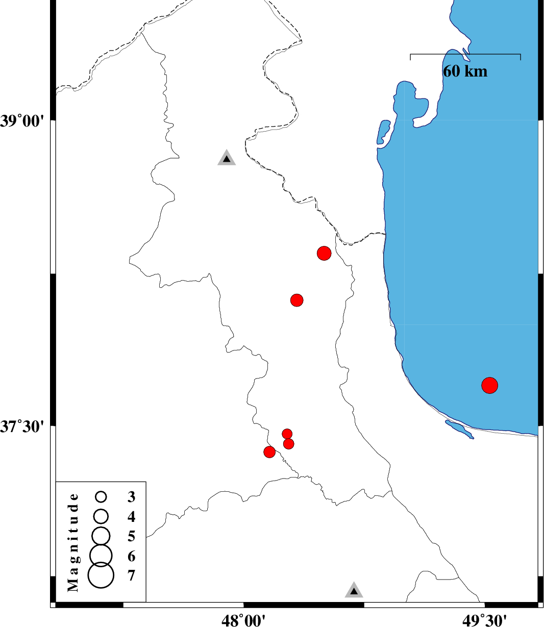 | 2012/02/04 | 20:04:14.0 | 23:34:14.0 | 37.7 | 49.53 | 40 | ML:4.5 | Caspian Sea, 26 km North of Bandar-e anzali | ||