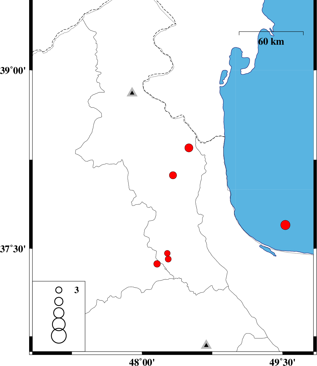 | 2012/02/03 | 13:02:46.5 | 16:32:46.5 | 37.41 | 48.28 | 14 | ML:2.9 | Ardebil Province, 33 km South-West of Givi | ||