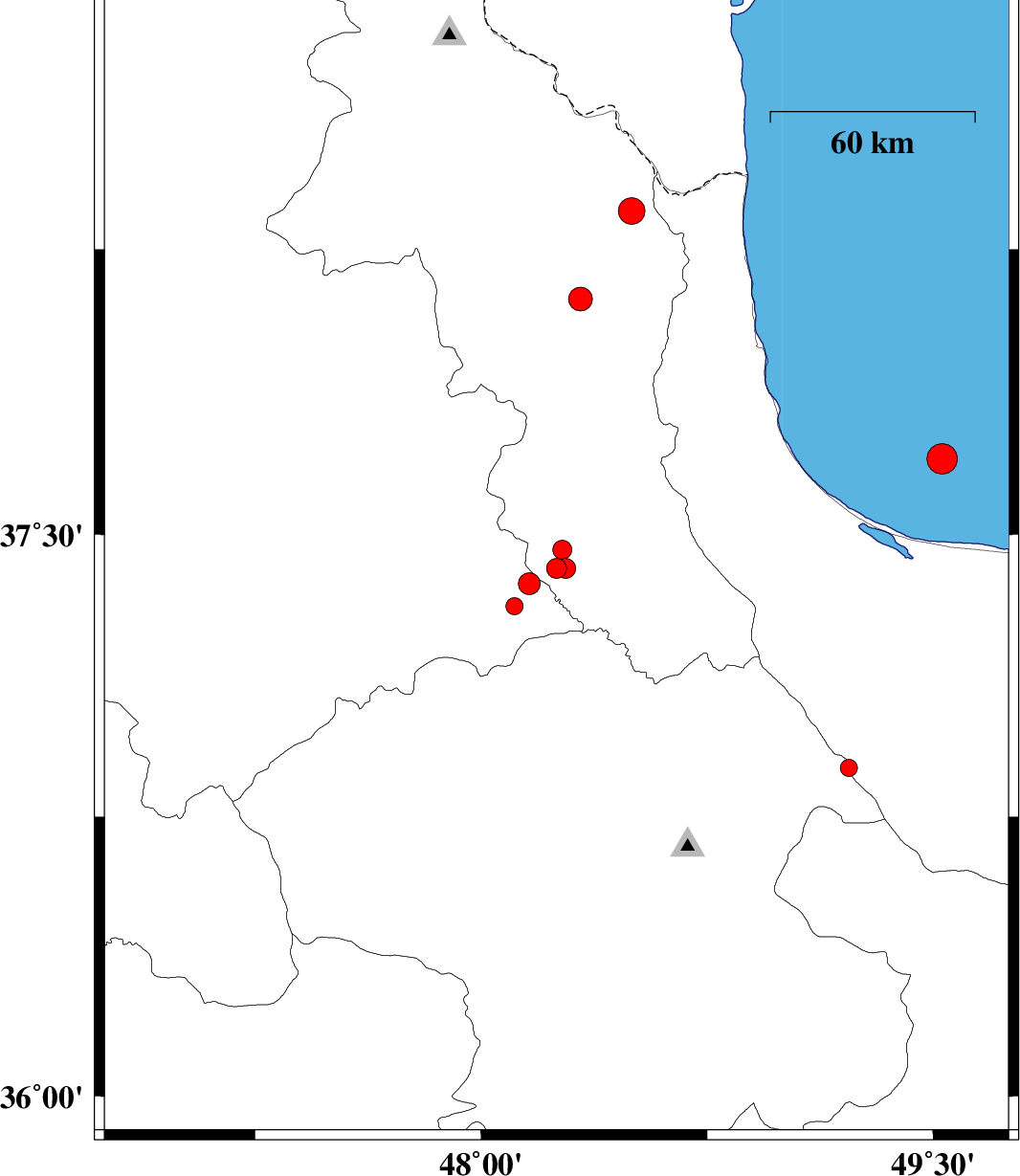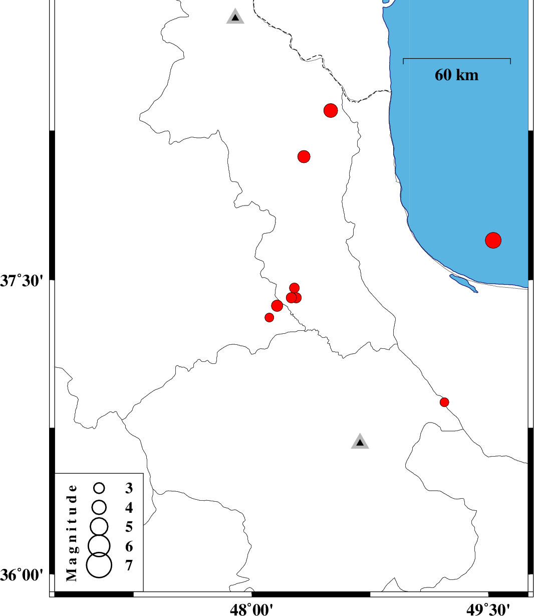 | 2012/02/04 | 20:04:14.0 | 23:34:14.0 | 37.7 | 49.53 | 40 | ML:4.5 | Caspian Sea, 26 km North of Bandar-e anzali | ||