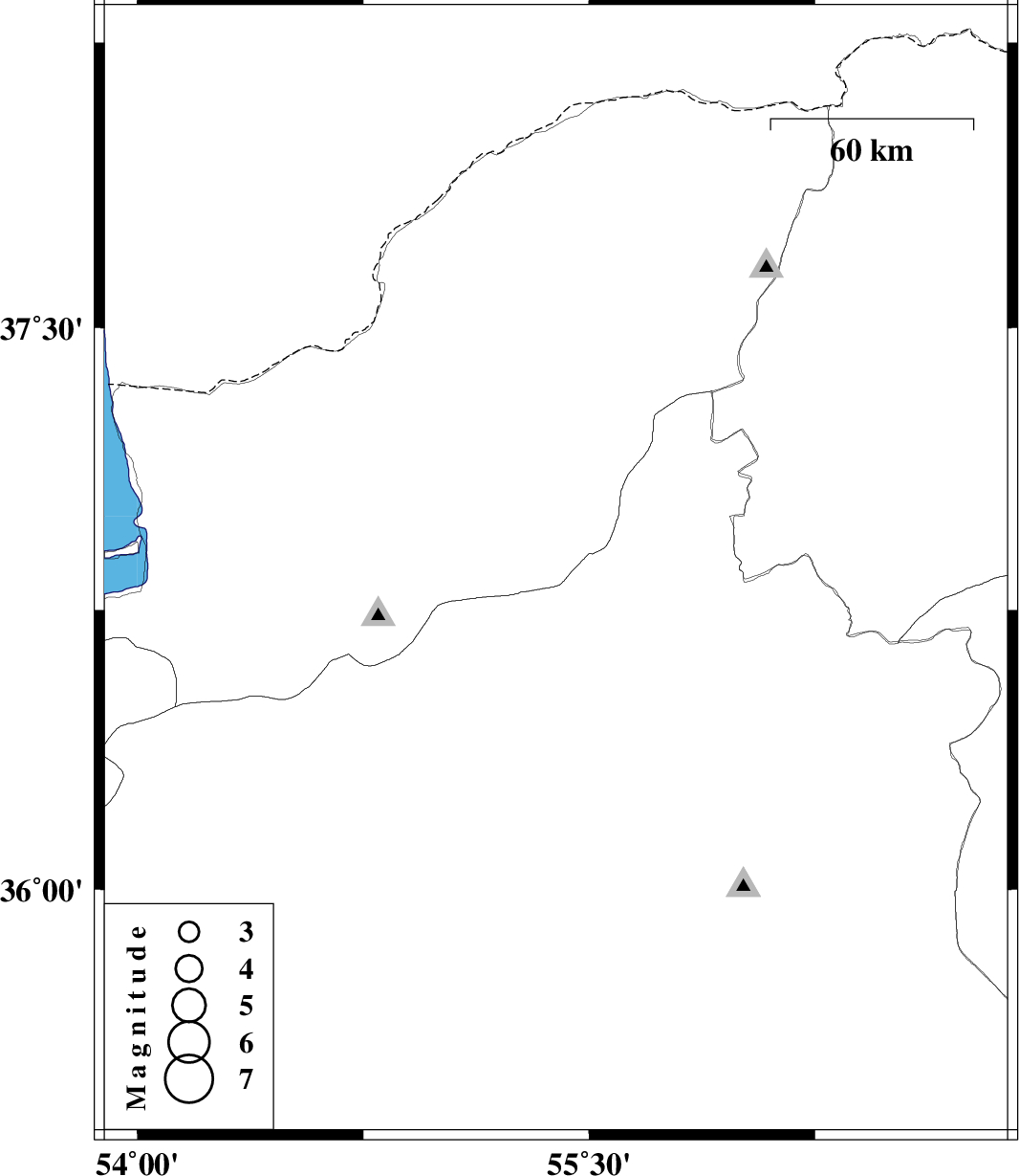 | 2012/02/13 | 15:09:44.6 | 18:39:44.6 | 36.85 | 55.39 | 14 | ML:3.5 | Golestan Province, 42 km South of Minodasht |