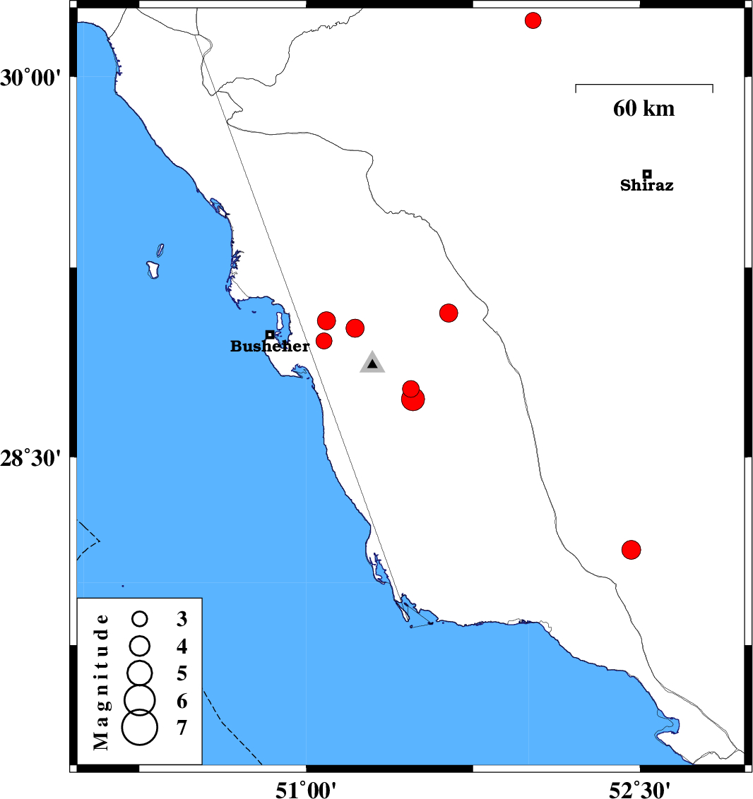 | 2012/01/25 | 11:14:06.2 | 14:44:06.2 | 28.96 | 51.08 | 17 | ML:3.3 | Bushehr Province, 20 km West of Ahram | ||