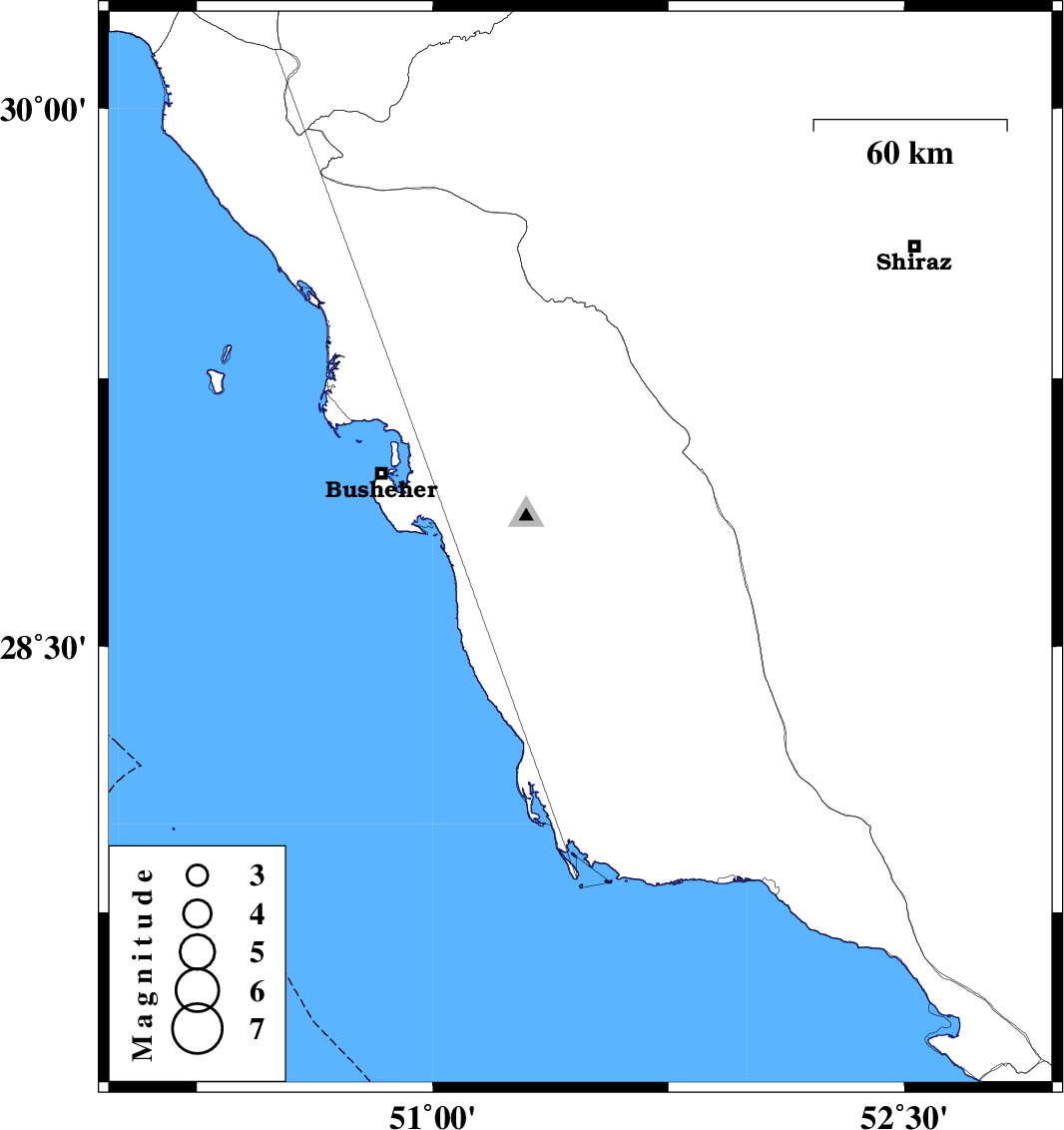 | 2012/02/16 | 21:00:41.6 | 00:30:41.6 | 28.77 | 51.47 | 16 | ML:3.4 | Bushehr Province, 16 km North of Khormog |