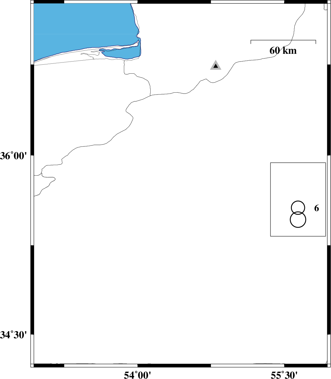 | 2012/02/13 | 15:09:44.6 | 18:39:44.6 | 36.85 | 55.39 | 14 | ML:3.5 | Golestan Province, 42 km South of Minodasht |