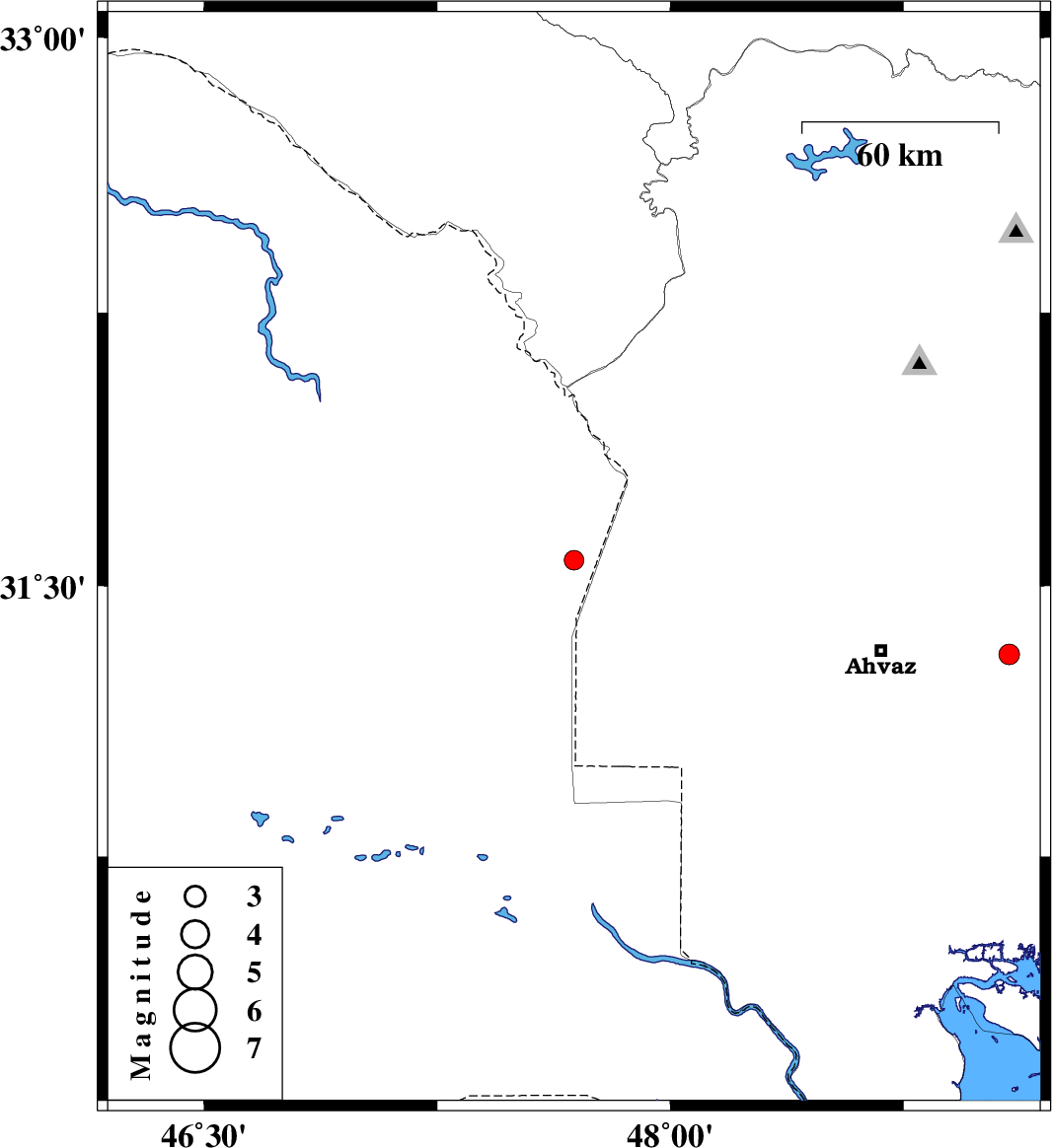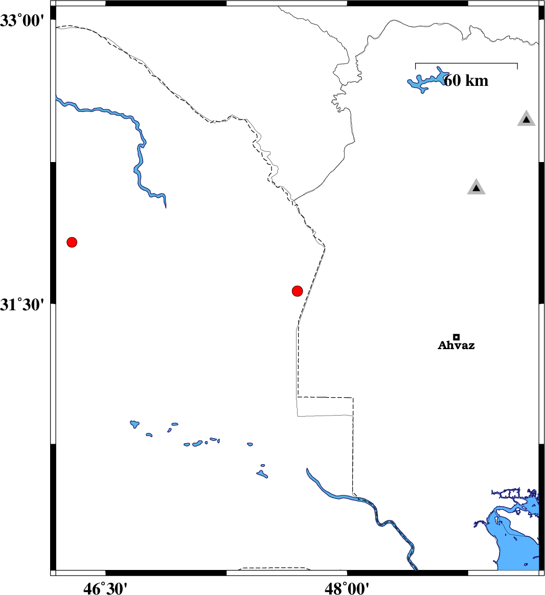 | 2012/02/23 | 15:54:18.0 | 19:24:18.0 | 31.57 | 47.69 | 41 | ML:2.8 | Iraq, 47 km West of Susangerd | ||
