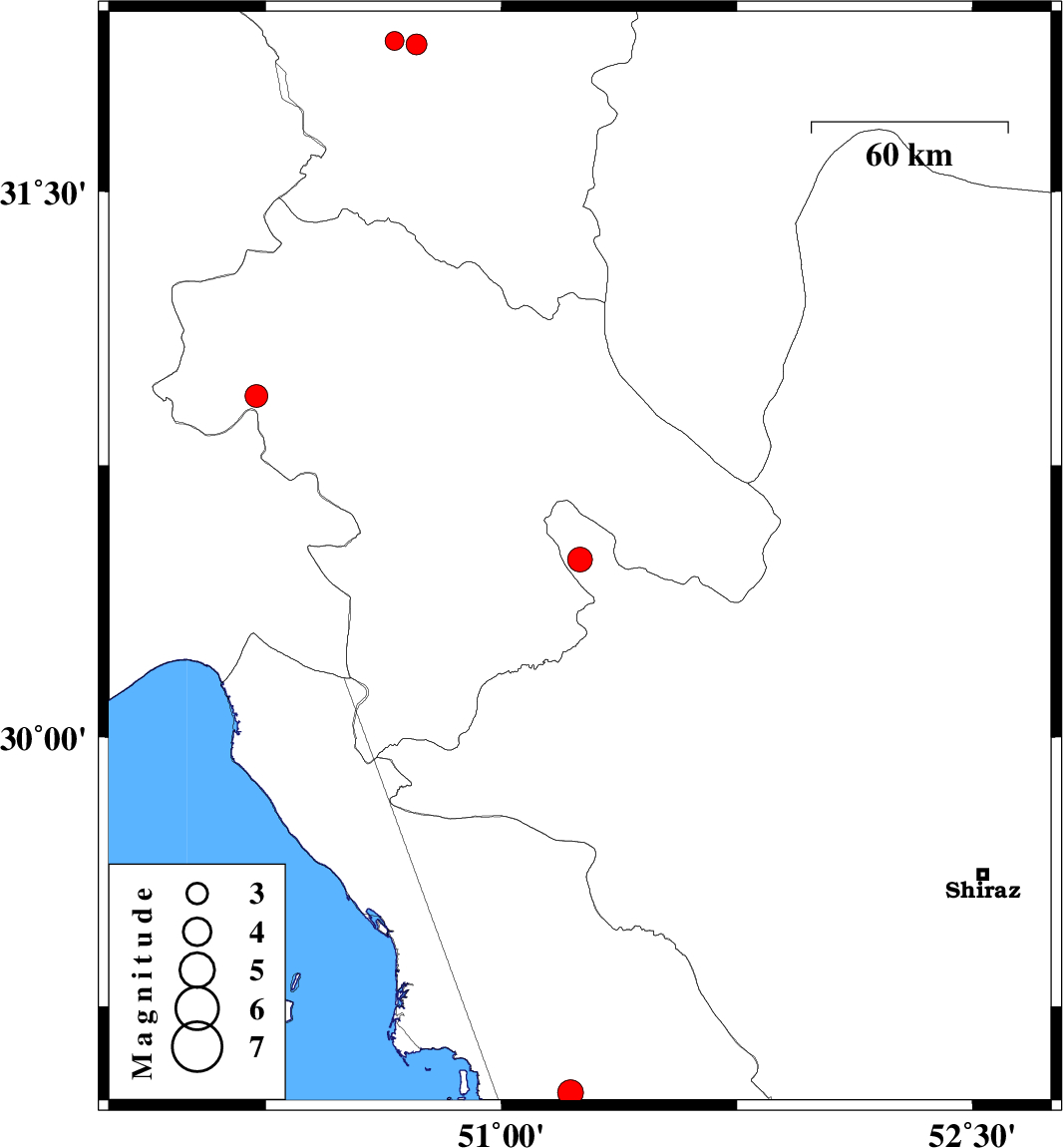 | 2012/01/27 | 00:52:45.8 | 04:22:45.8 | 29.01 | 51.22 | 16 | ML:3.7 | Bushehr Province, 16 km North of Ahram |