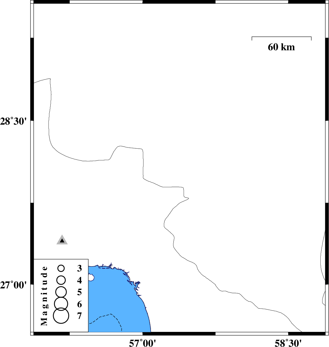 | 2012/02/28 | 18:51:06.6 | 22:21:06.6 | 28.06 | 57.38 | 14 | ML:3.8 | Kerman Province, 33 km North-West of Kahnuj |
