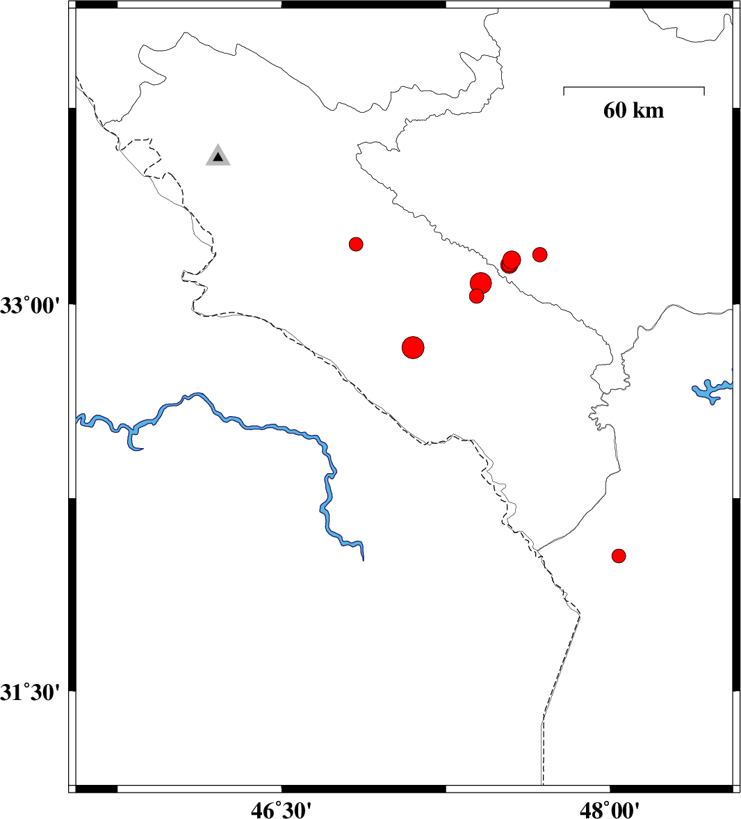 | 2012/02/23 | 15:54:18.0 | 19:24:18.0 | 31.57 | 47.69 | 41 | ML:2.8 | Iraq, 47 km West of Susangerd |