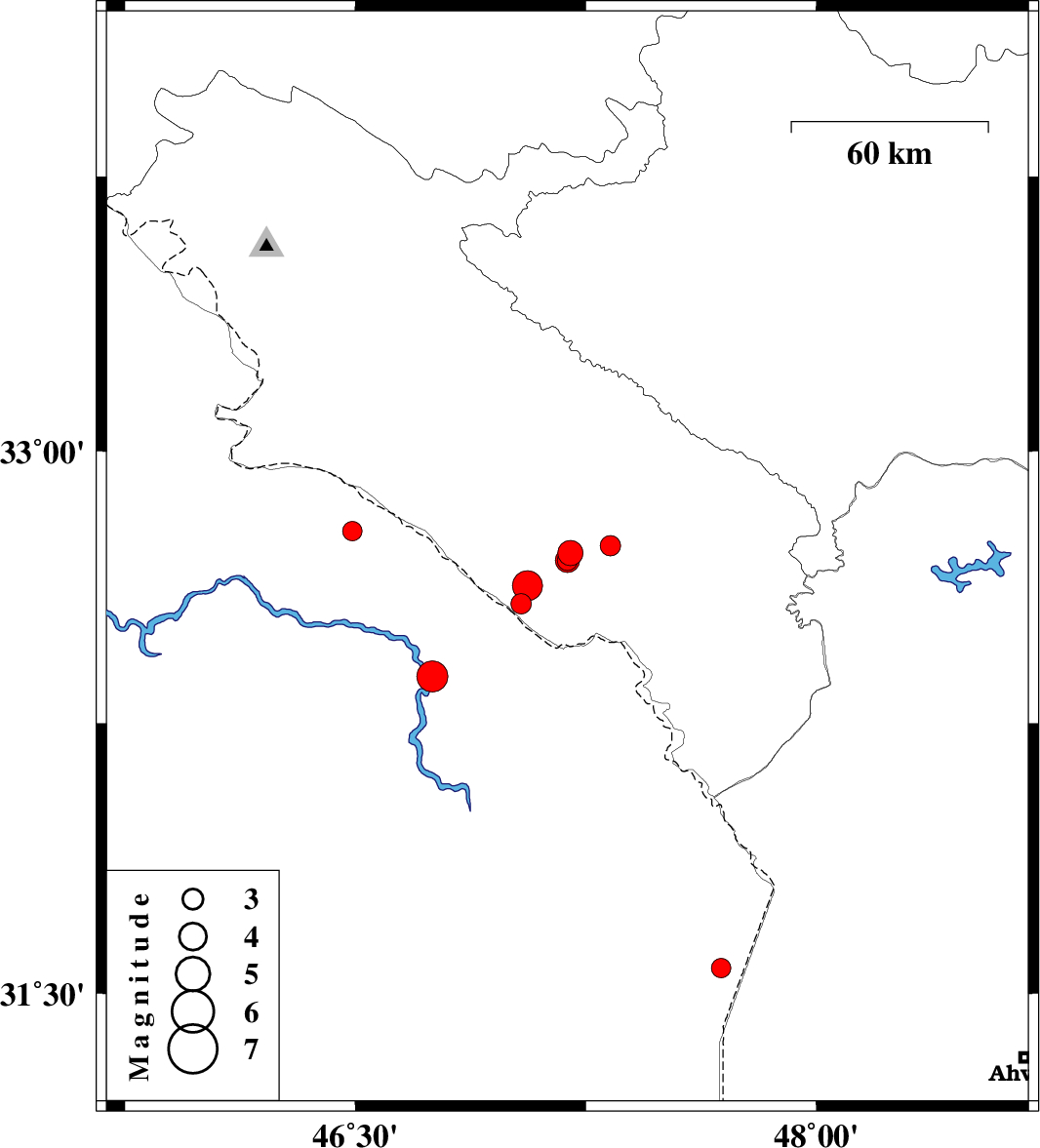 | 2012/02/23 | 15:54:18.0 | 19:24:18.0 | 31.57 | 47.69 | 41 | ML:2.8 | Iraq, 47 km West of Susangerd |