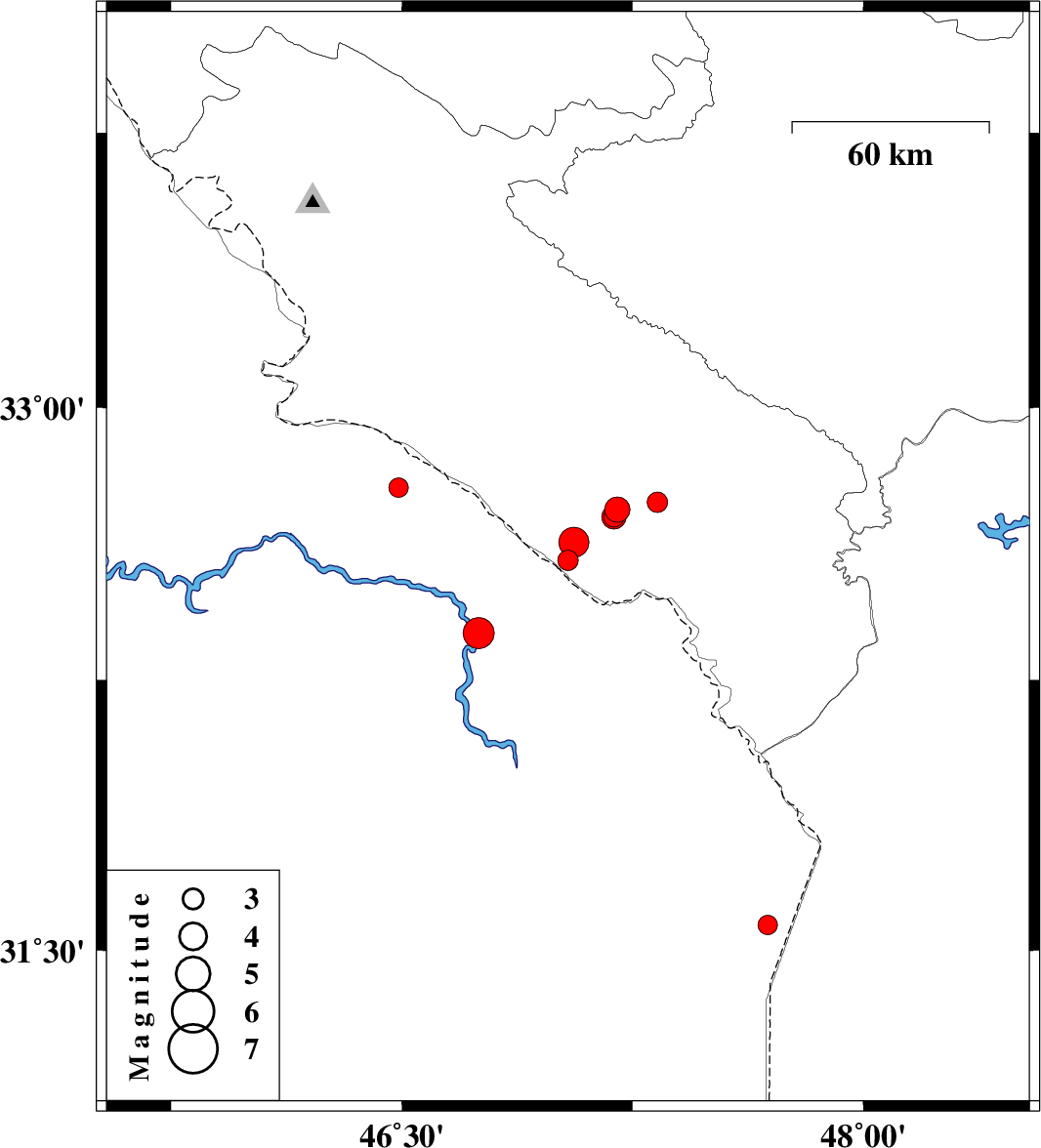 | 2012/02/23 | 15:54:18.0 | 19:24:18.0 | 31.57 | 47.69 | 41 | ML:2.8 | Iraq, 47 km West of Susangerd |