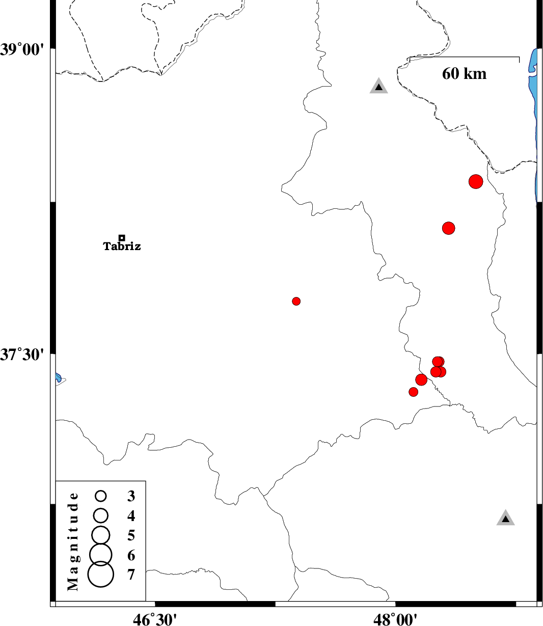 | 2012/03/03 | 15:00:42.5 | 18:30:42.5 | 37.76 | 47.38 | 59 | ML:2.3 | Azarbaijan Sharghi Province, 24 km South-West of Sarab | ||