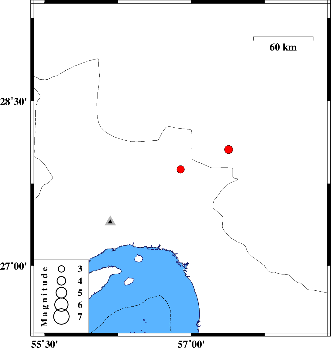 | 2012/03/05 | 19:30:15.2 | 23:00:15.2 | 27.88 | 56.89 | 14 | ML:3.5 | Hormozgan Province, 61 km North-West of Dehbarez | ||