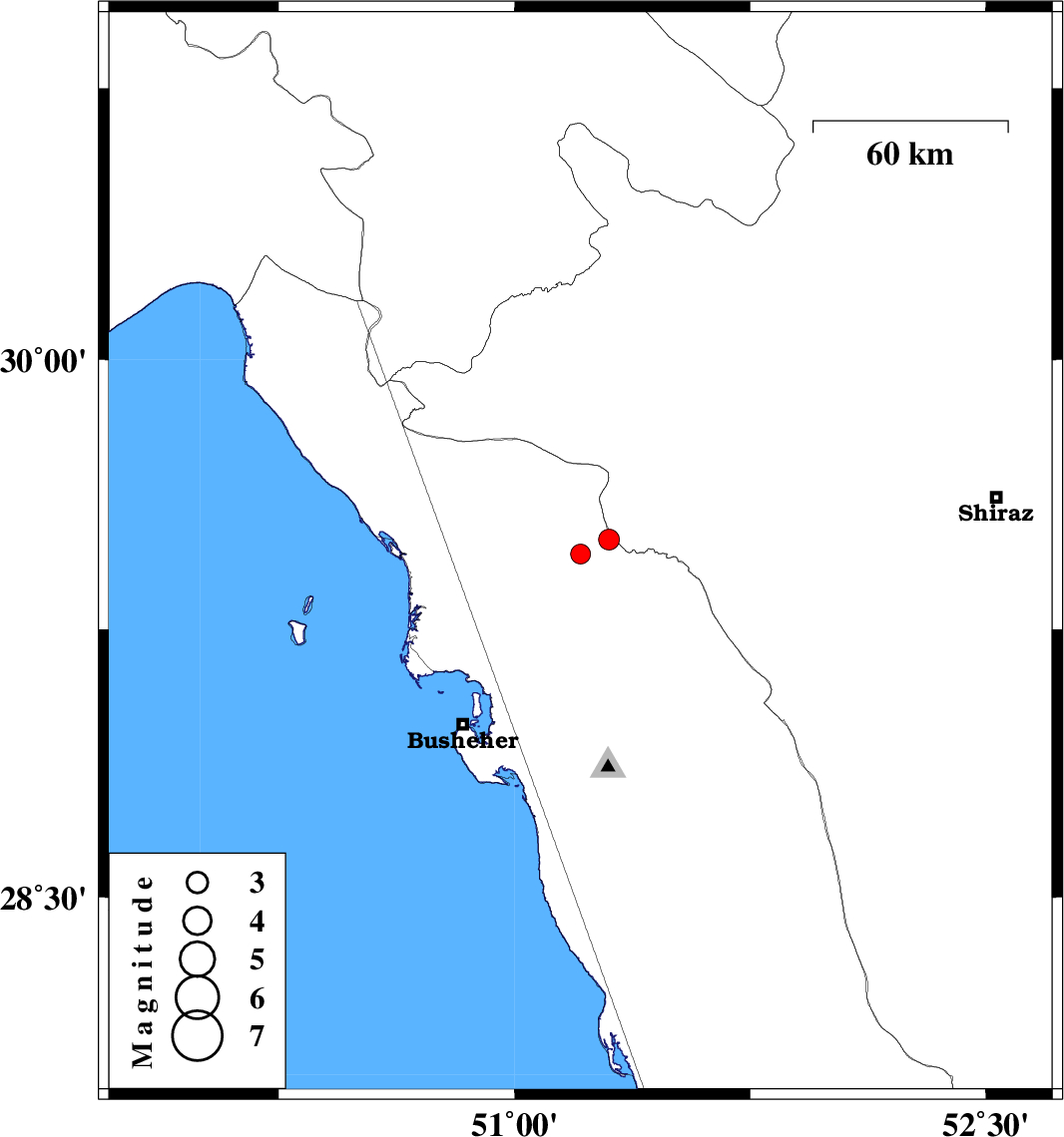 | 2012/03/06 | 20:09:54.8 | 23:39:54.8 | 29.46 | 51.21 | 45 | ML:2.8 | Bushehr Province, 22 km North of Borazjan | ||