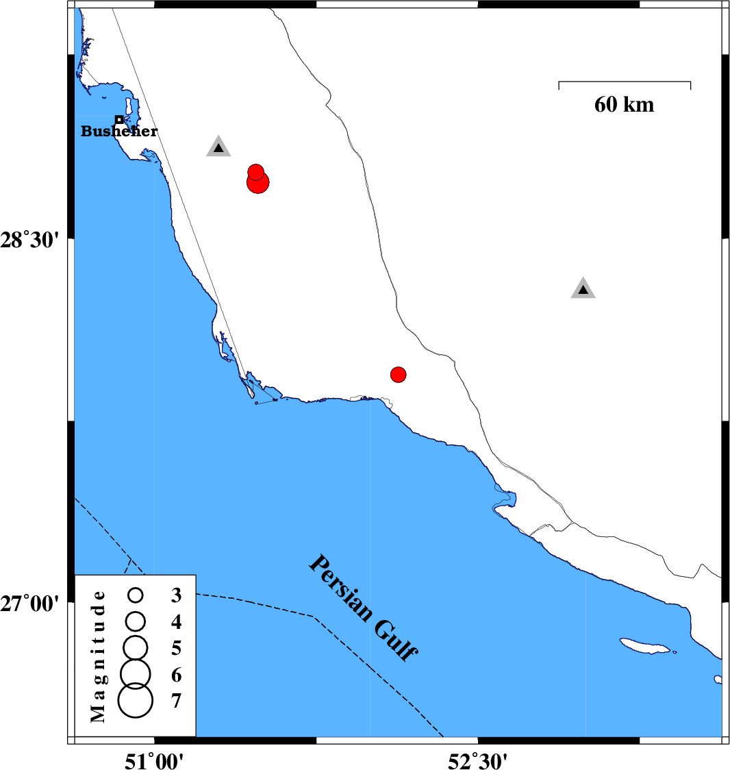 | 2012/02/05 | 06:10:40.9 | 09:40:40.9 | 28.73 | 51.48 | 14 | ML:4.7 | Bushehr Province, 14 km East of Khormog |