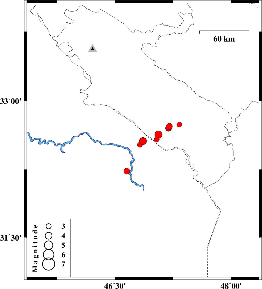 | 2012/03/03 | 15:48:48.3 | 19:18:48.3 | 32.52 | 46.82 | 18 | ML:3 | Iraq, 46 km South-West of Dehloran | ||