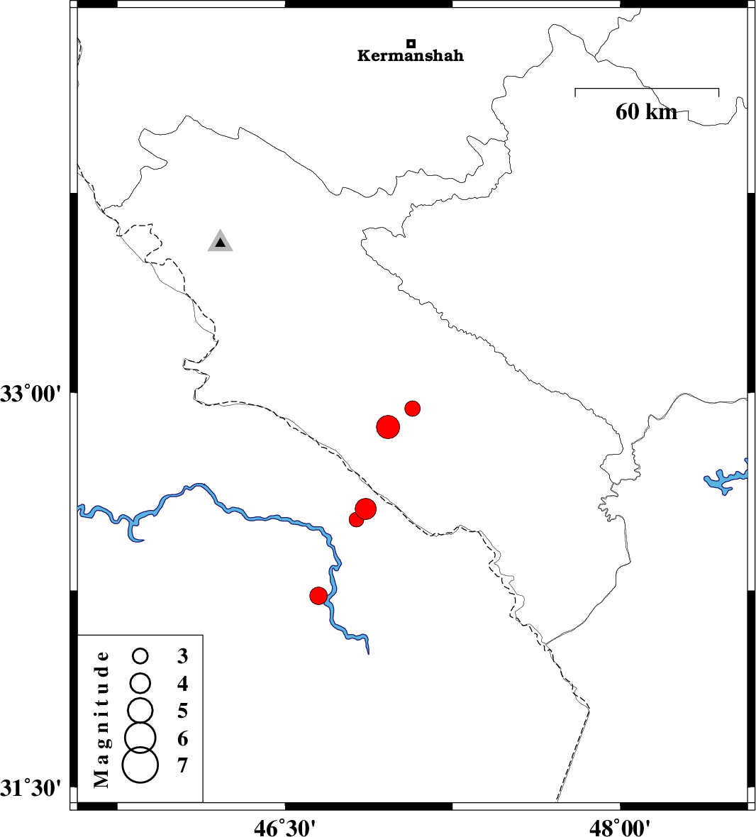 | 2012/03/03 | 15:48:48.3 | 19:18:48.3 | 32.52 | 46.82 | 18 | ML:3 | Iraq, 46 km South-West of Dehloran | ||
