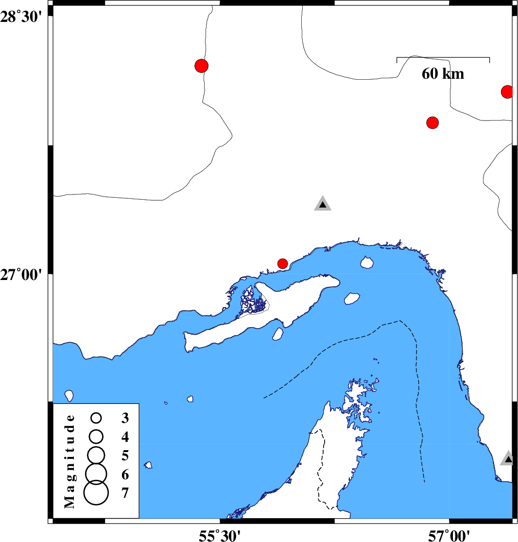 | 2012/03/05 | 19:30:15.2 | 23:00:15.2 | 27.88 | 56.89 | 14 | ML:3.5 | Hormozgan Province, 61 km North-West of Dehbarez | ||