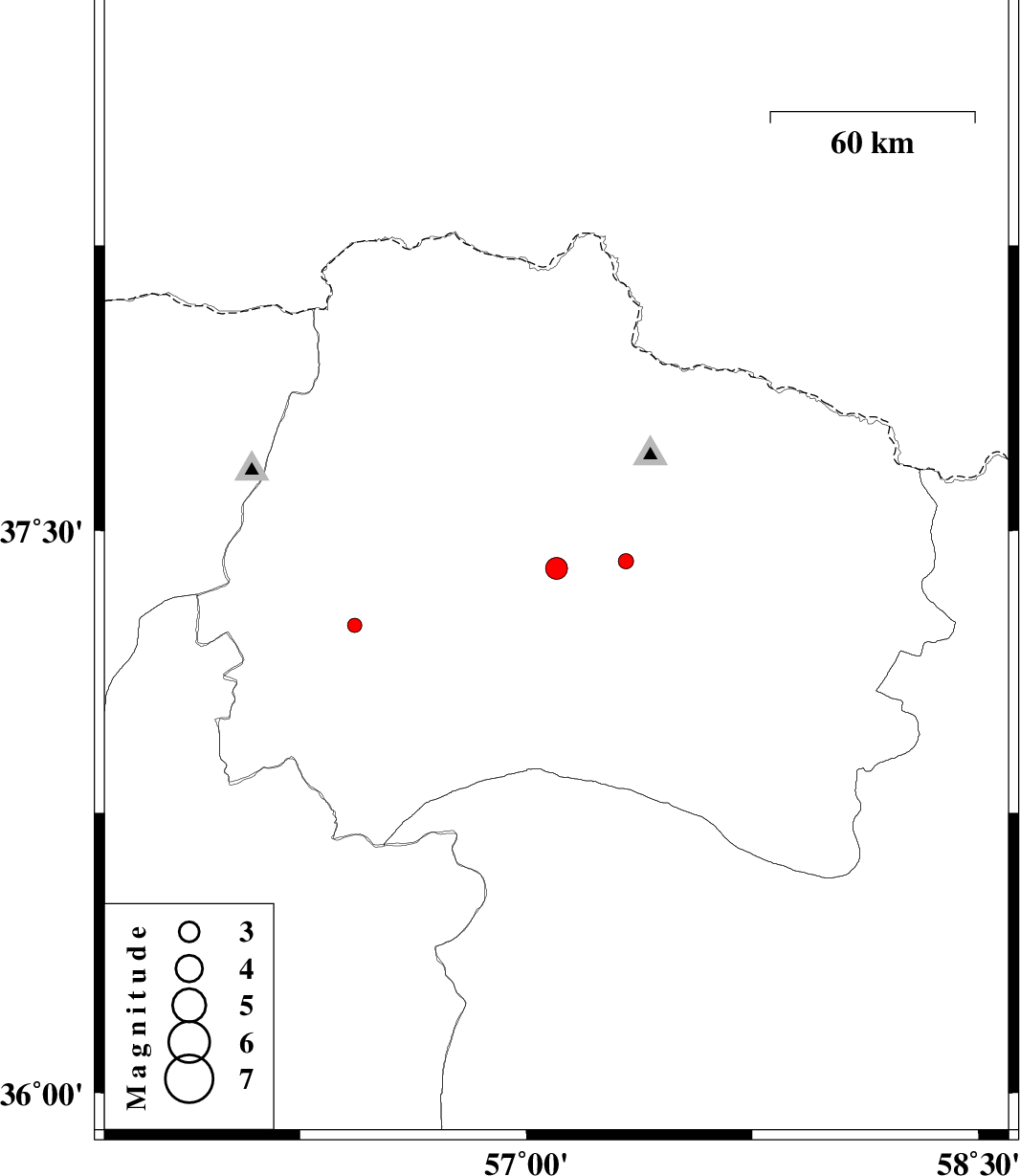 | 2012/02/20 | 13:52:42.5 | 17:22:42.5 | 37.25 | 56.43 | 46 | ML:2.1 | Khorasan(north) Province, 33 km North of Jajarm | ||