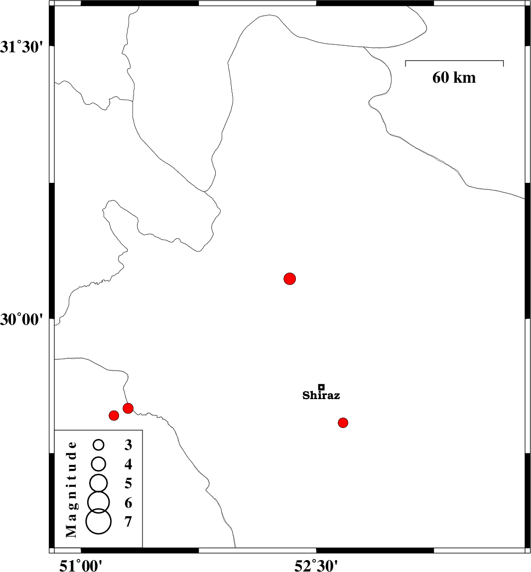 | 2012/03/07 | 21:20:46.1 | 00:50:46.1 | 29.42 | 52.67 | 14 | ML:2.8 | Fars Province, 26 km South-East of Shiraz | ||