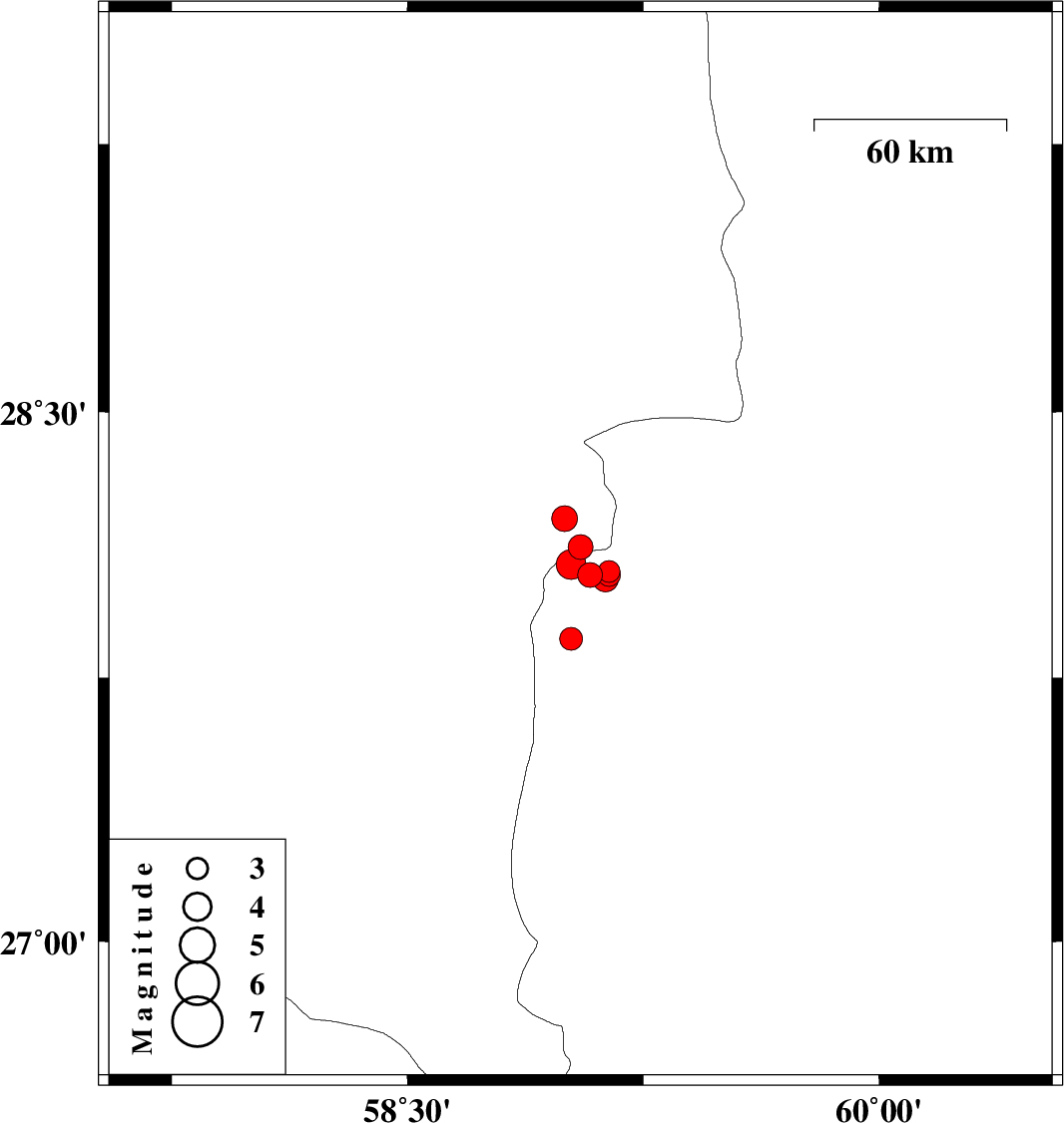 | 2012/03/11 | 05:00:05.5 | 08:30:05.5 | 28.07 | 59.02 | 15 | ML:4.2 | Sistan va Baloochestan Province, 131 km North-East of Kahnuj | ||