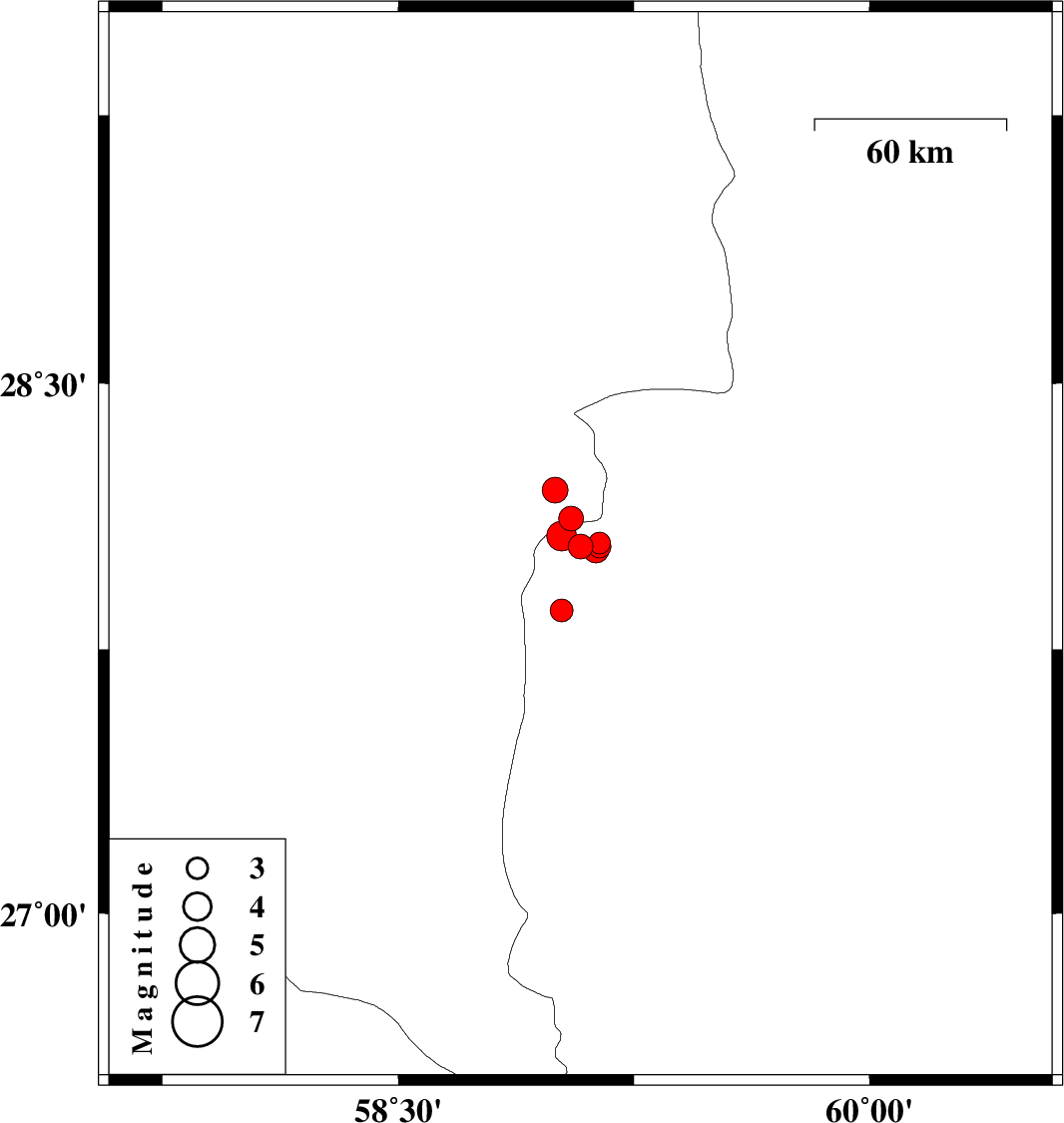 | 2012/03/11 | 05:00:05.5 | 08:30:05.5 | 28.07 | 59.02 | 15 | ML:4.2 | Sistan va Baloochestan Province, 131 km North-East of Kahnuj | ||