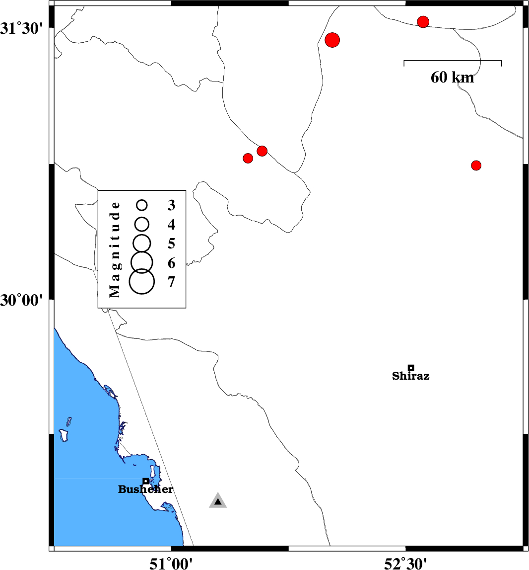 | 2012/03/06 | 20:09:54.8 | 23:39:54.8 | 29.46 | 51.21 | 45 | ML:2.8 | Bushehr Province, 22 km North of Borazjan | ||