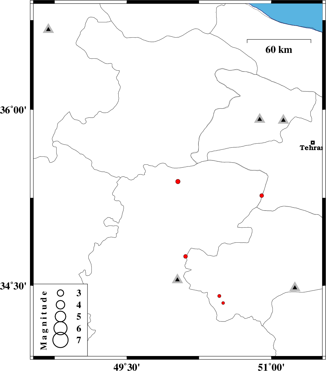 | 2012/03/09 | 14:38:31.0 | 18:08:31.0 | 35.27 | 50.9 | 46 | ML:1.8 | Tehran Province, 28 km South-West of Robatkarim | ||