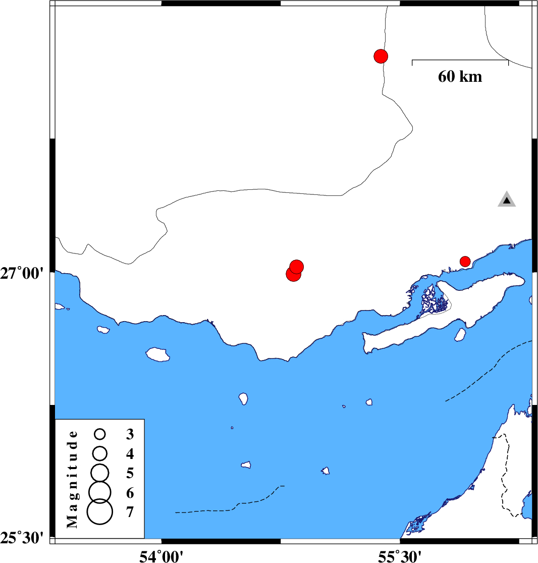 | 2012/03/12 | 05:09:52.6 | 08:39:52.6 | 26.99 | 54.83 | 15 | ML:4.2 | Hormozgan Province, 52 km North of Bandar-e lengeh | ||