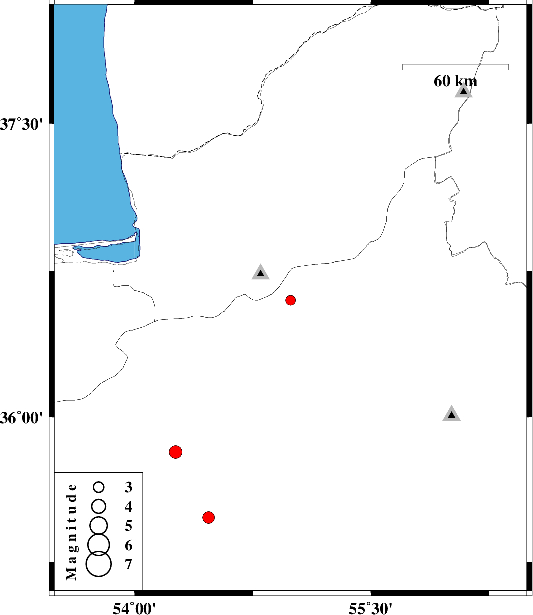 | 2012/03/06 | 06:34:25.3 | 10:04:25.3 | 35.82 | 54.26 | 16 | ML:3.6 | Semnan Province, 39 km South of Damghan |