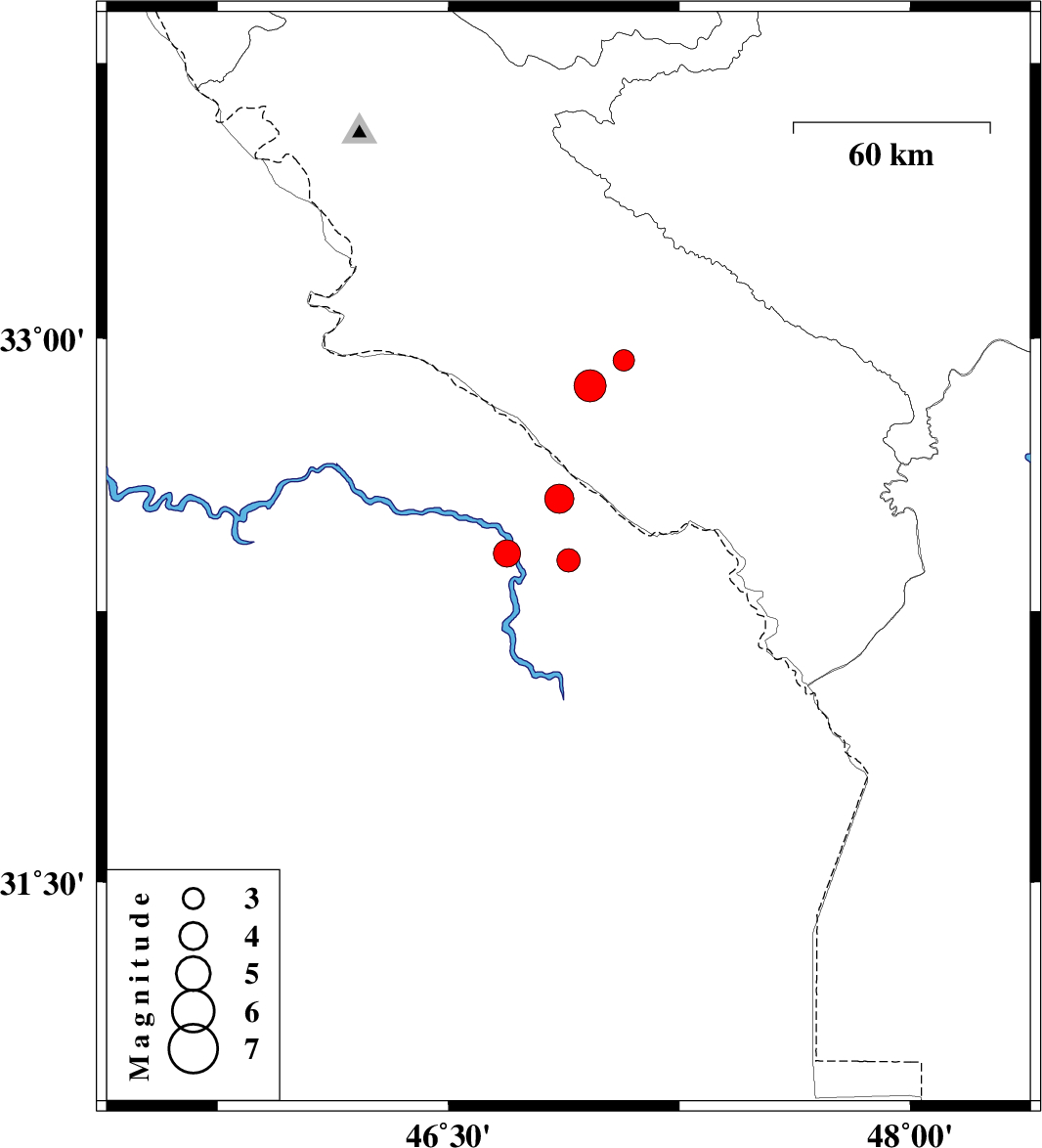 | 2012/03/10 | 21:41:05.8 | 01:11:05.8 | 32.41 | 46.69 | 46 | ML:4 | Iraq, 62 km South-West of Dehloran | ||