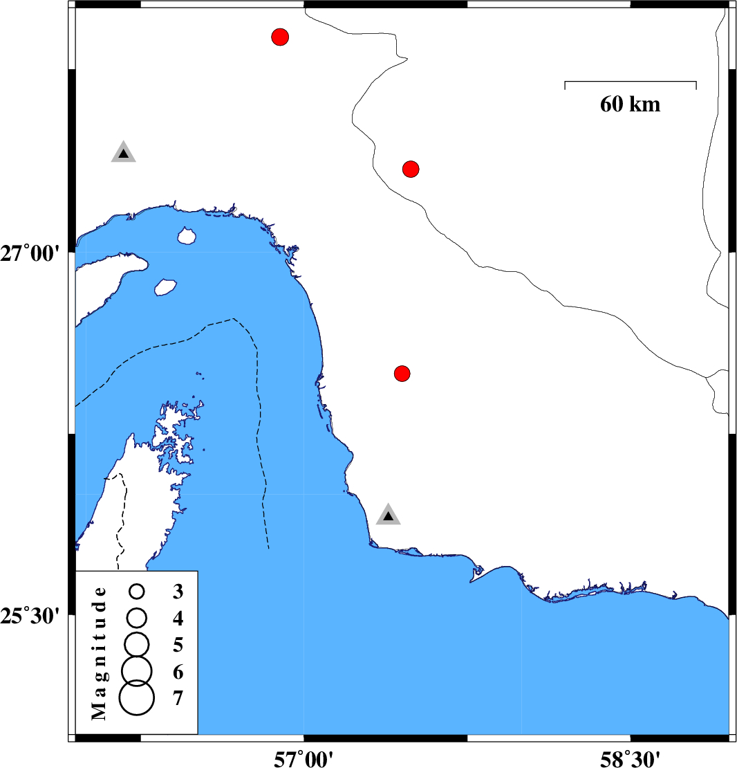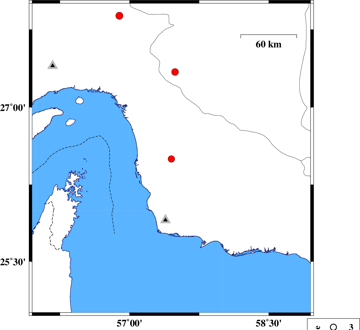 | 2012/03/05 | 19:30:15.2 | 23:00:15.2 | 27.88 | 56.89 | 14 | ML:3.5 | Hormozgan Province, 61 km North-West of Dehbarez |