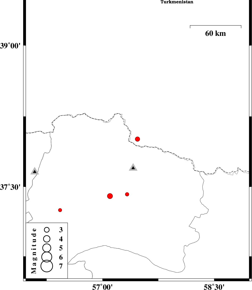 | 2012/02/20 | 13:52:42.5 | 17:22:42.5 | 37.25 | 56.43 | 46 | ML:2.1 | Khorasan(north) Province, 33 km North of Jajarm | ||