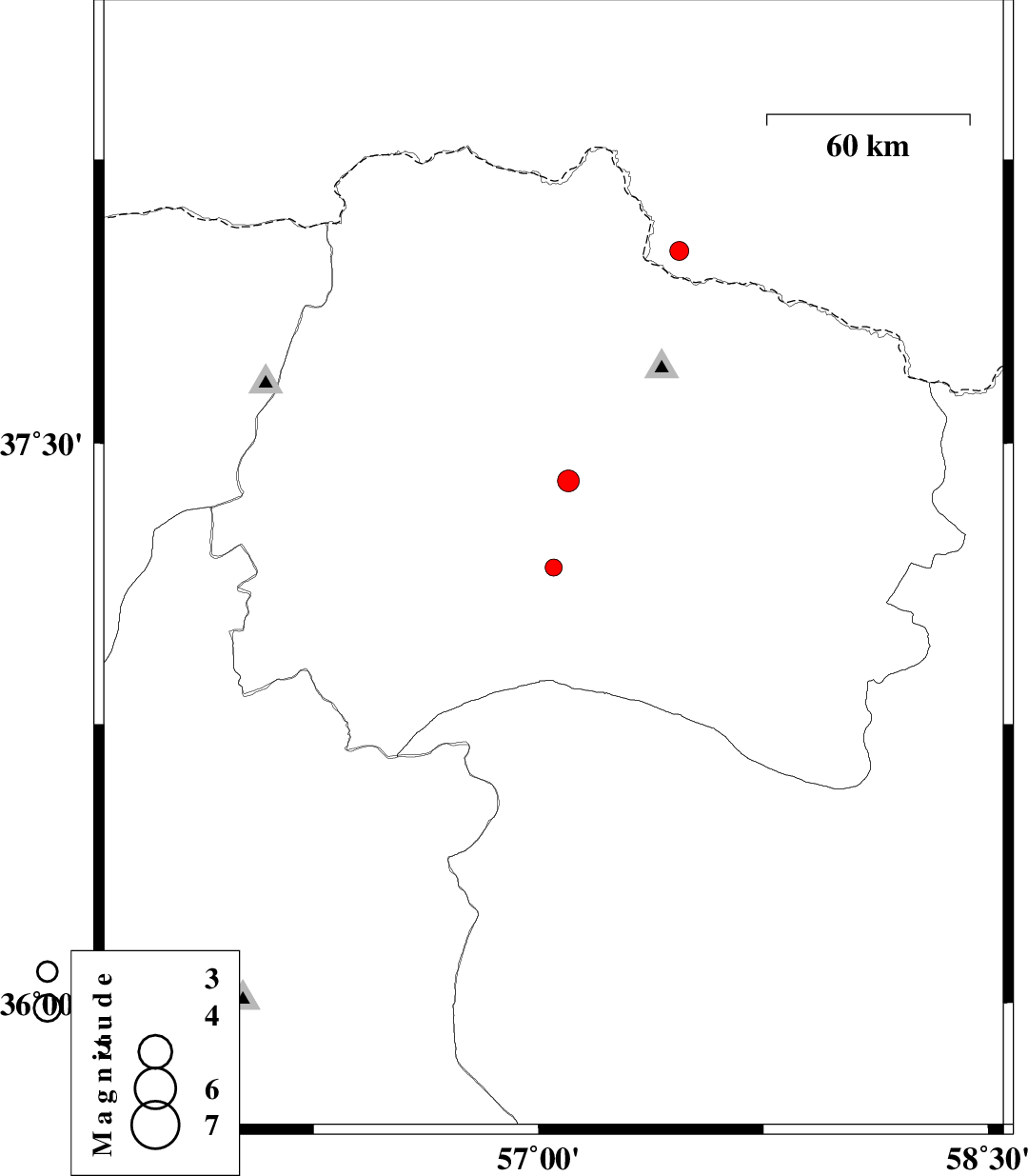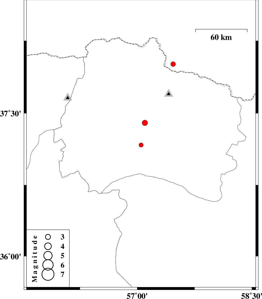 | 2012/03/10 | 15:54:28.6 | 19:24:28.6 | 37.4 | 57.1 | 15 | ML:3.2 | Khorasan(north) Province, 22 km West of Bojnurd |