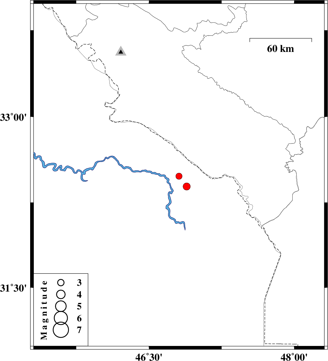 | 2012/03/19 | 04:29:55.1 | 07:59:55.1 | 32.48 | 46.81 | 18 | ML:3 | Iraq, 48 km South-West of Dehloran | ||