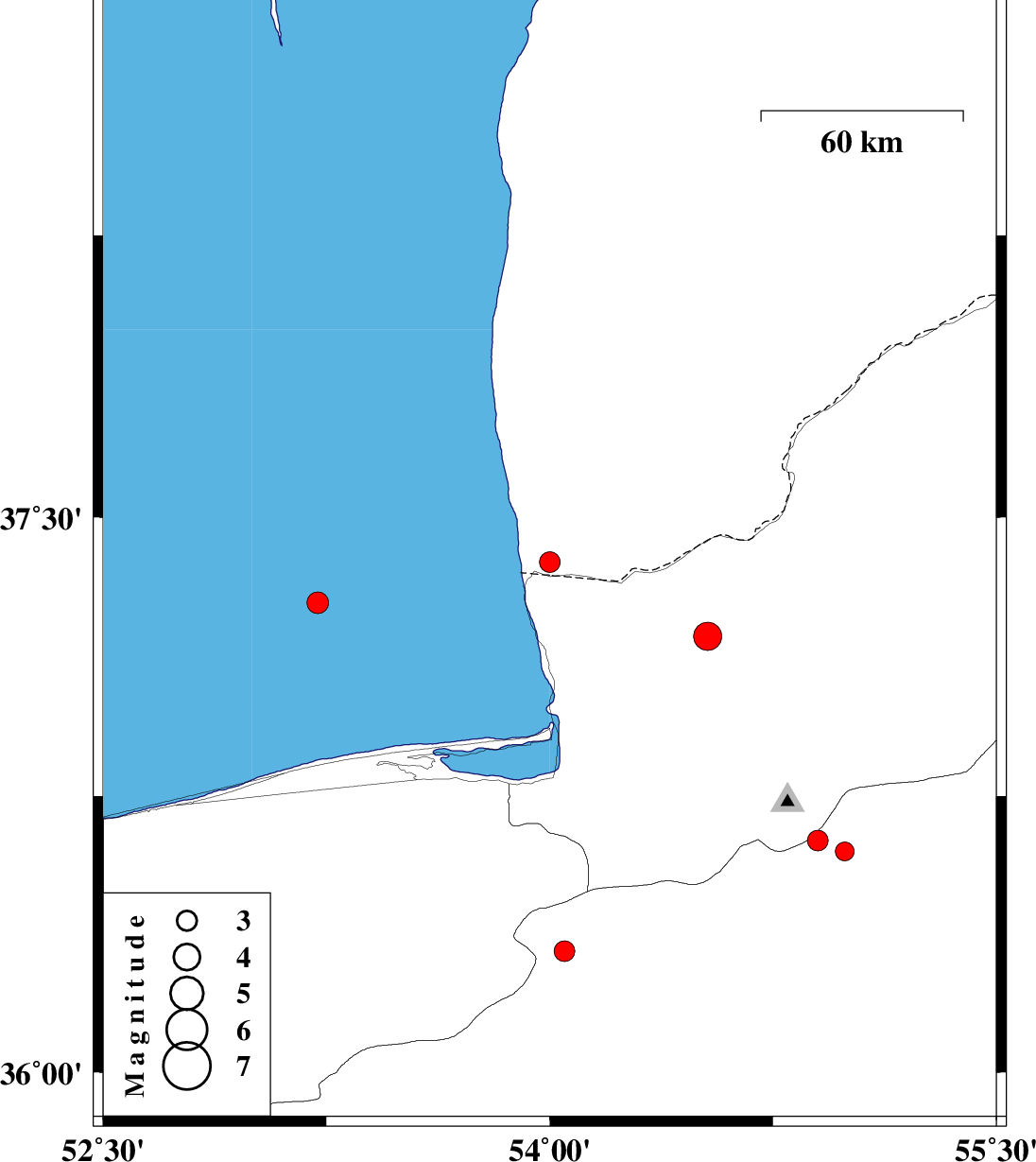 | 2012/03/19 | 03:03:24.2 | 06:33:24.2 | 37.38 | 54 | 14 | ML:3.1 | 54 km North of Bandar-e torkaman | ||