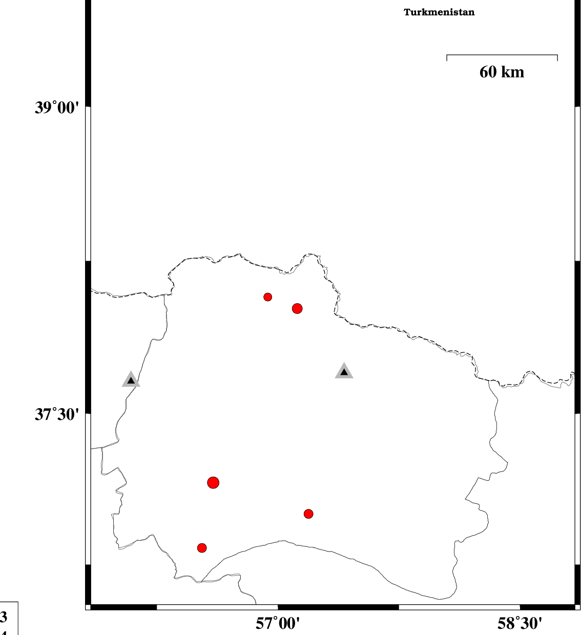 | 2012/03/10 | 15:54:28.6 | 19:24:28.6 | 37.4 | 57.1 | 15 | ML:3.2 | Khorasan(north) Province, 22 km West of Bojnurd | ||