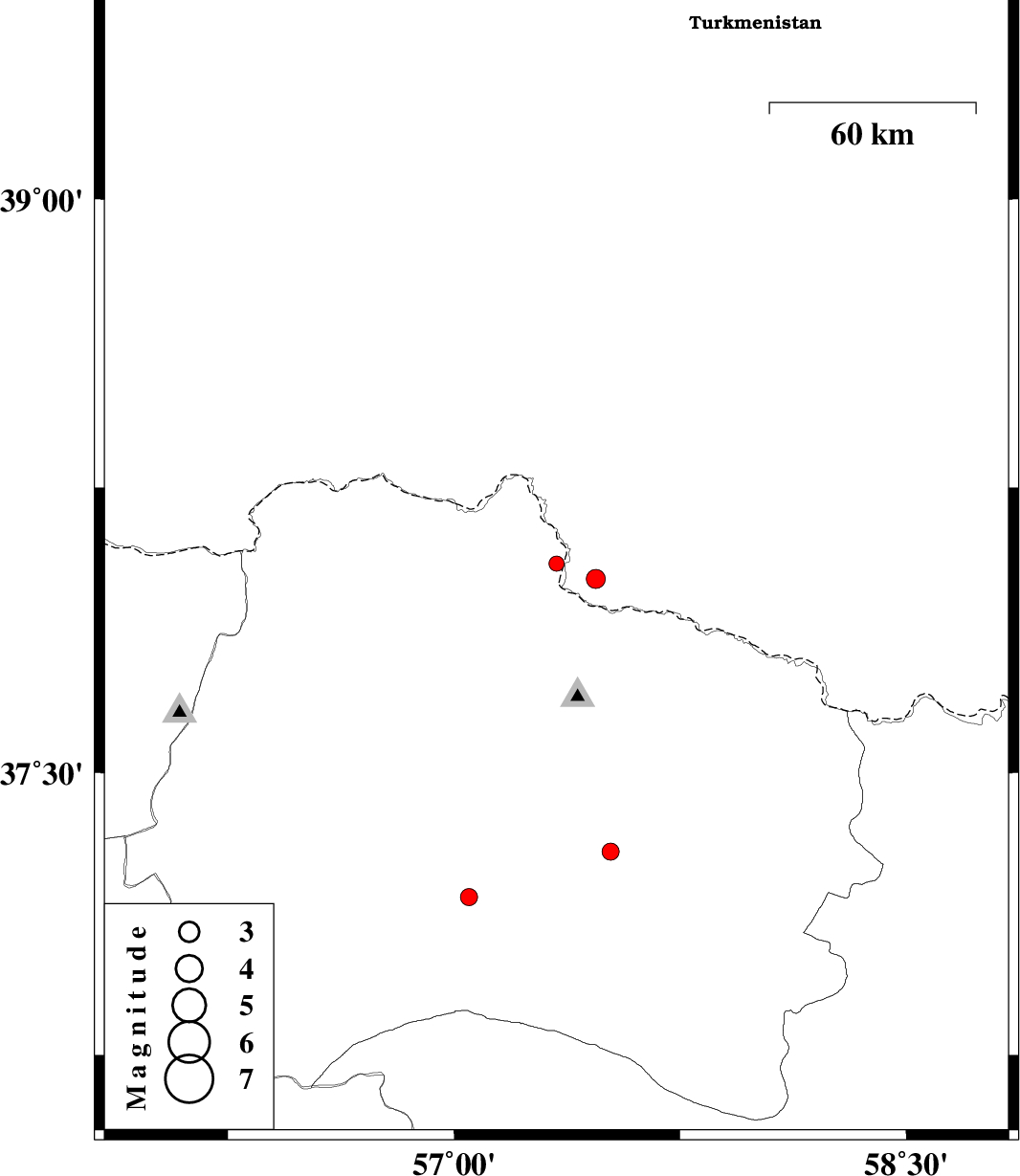 | 2012/03/16 | 23:01:24.8 | 02:31:24.8 | 38.01 | 57.47 | 14 | ML:2.8 | 61 km North-East of Bojnurd |