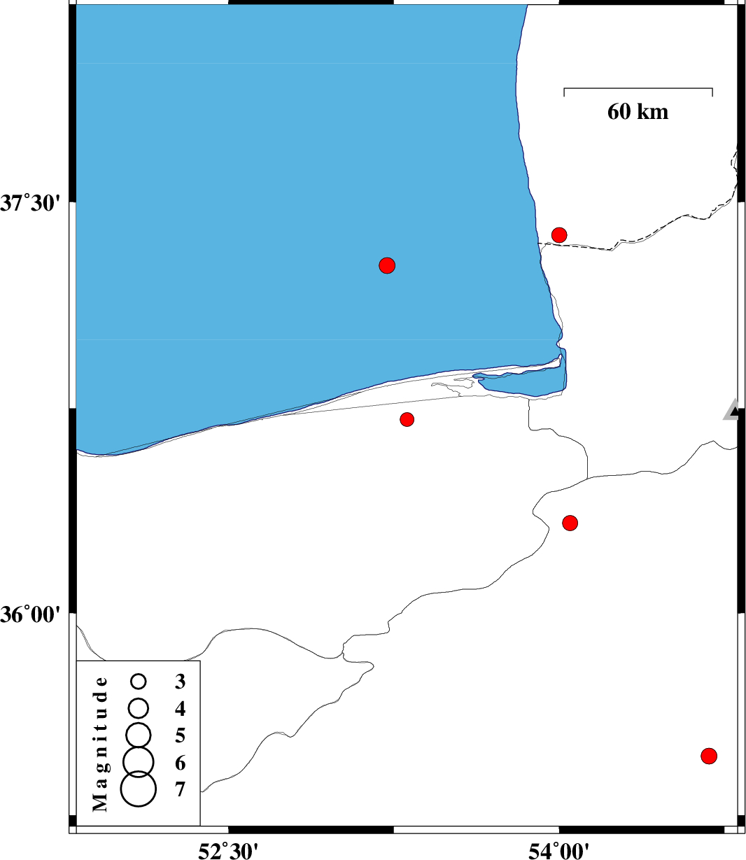 | 2012/03/13 | 04:45:37.8 | 08:15:37.8 | 37.27 | 53.22 | 14 | ML:3.3 | Caspian Sea, 70 km North of Neka |