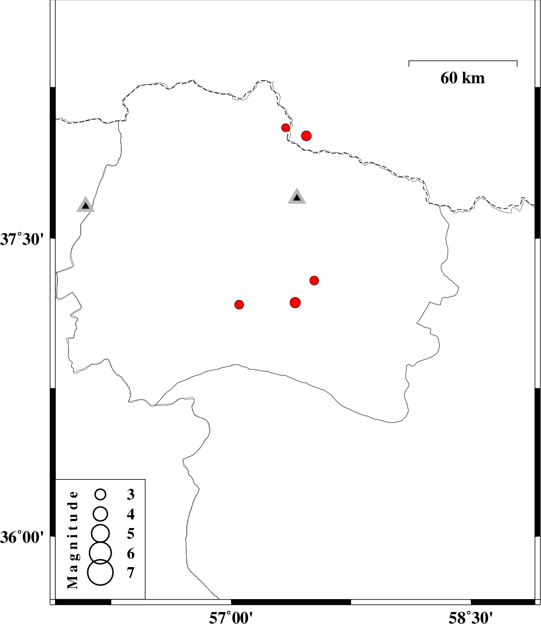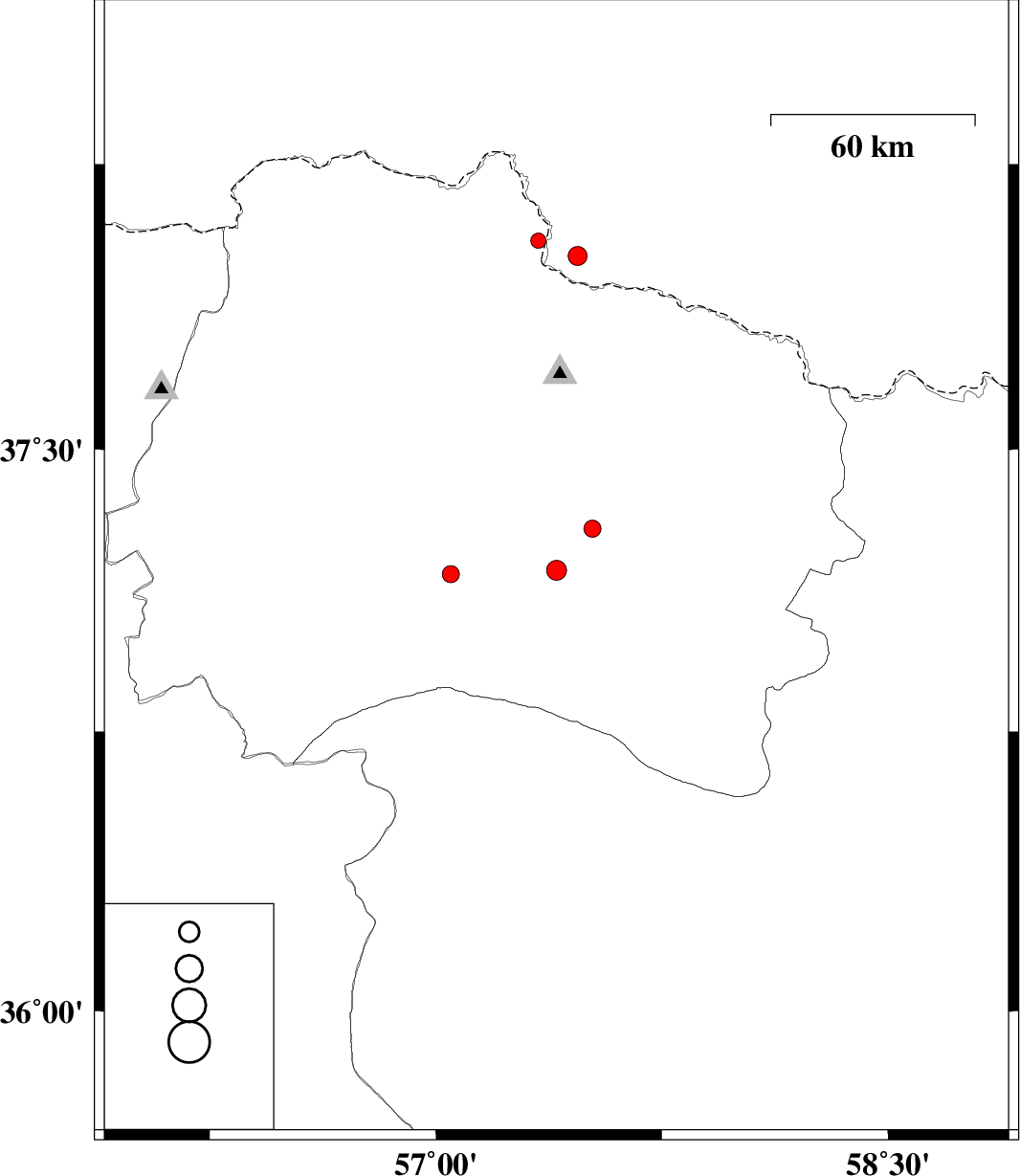| 2012/03/16 | 23:01:24.8 | 02:31:24.8 | 38.01 | 57.47 | 14 | ML:2.8 | 61 km North-East of Bojnurd |