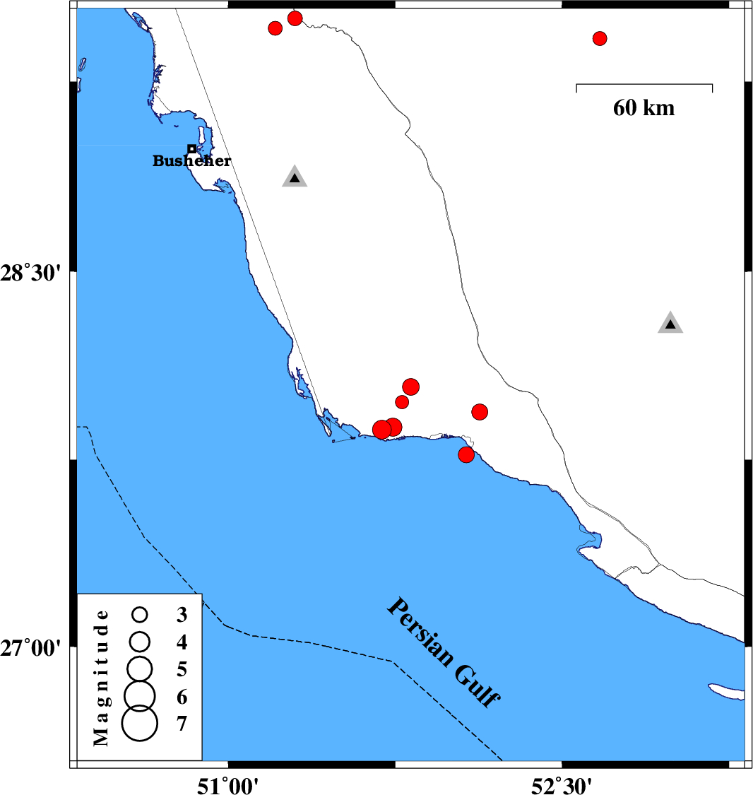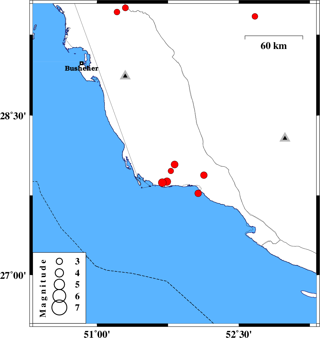 | 2012/03/06 | 23:35:52.4 | 03:05:52.4 | 27.94 | 52.13 | 41 | ML:3.3 | Bushehr Province, 15 km North of Bandar-e kangan | ||