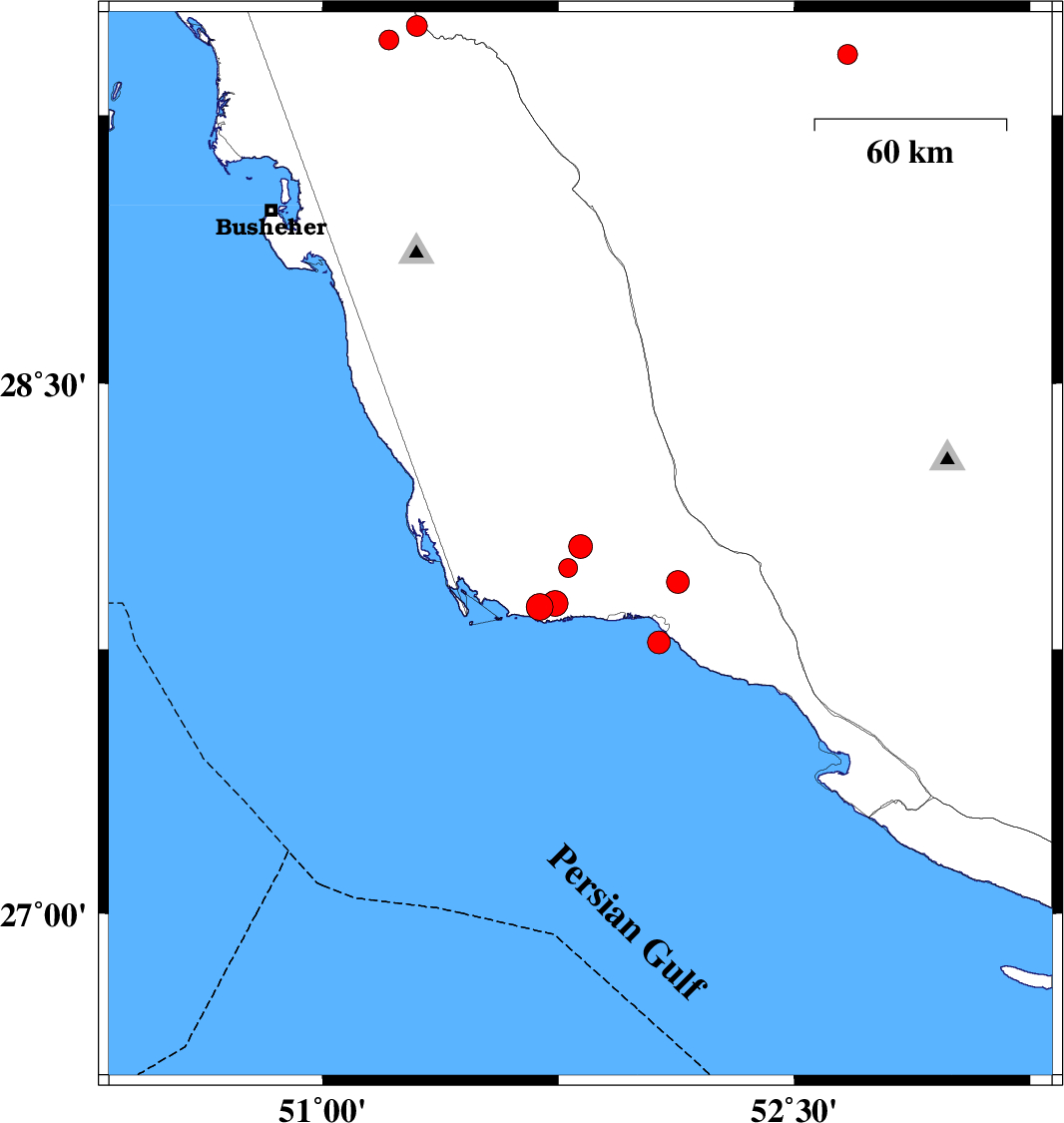 | 2012/03/22 | 16:39:08.2 | 21:09:08.2 | 27.87 | 51.69 | 43 | ML:3.8 | Bushehr Province, 37 km West of Bandar-e kangan | ||