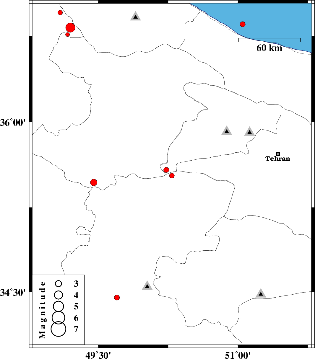 | 2012/03/17 | 01:47:18.1 | 05:17:18.1 | 36.85 | 51.05 | 14 | ML:2.6 | Caspian Sea, 14 km East of Tonekabon | ||