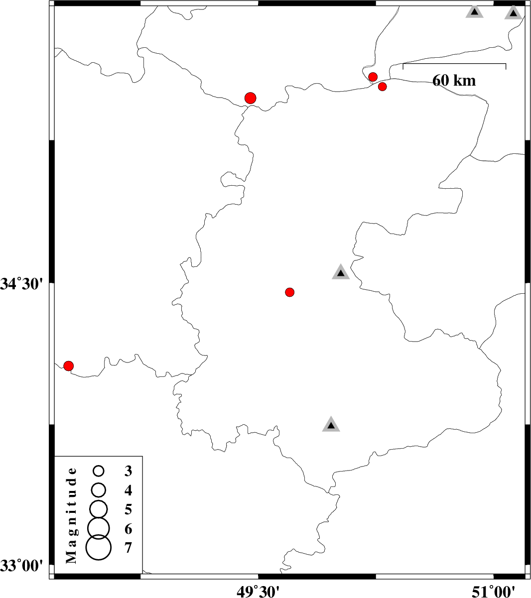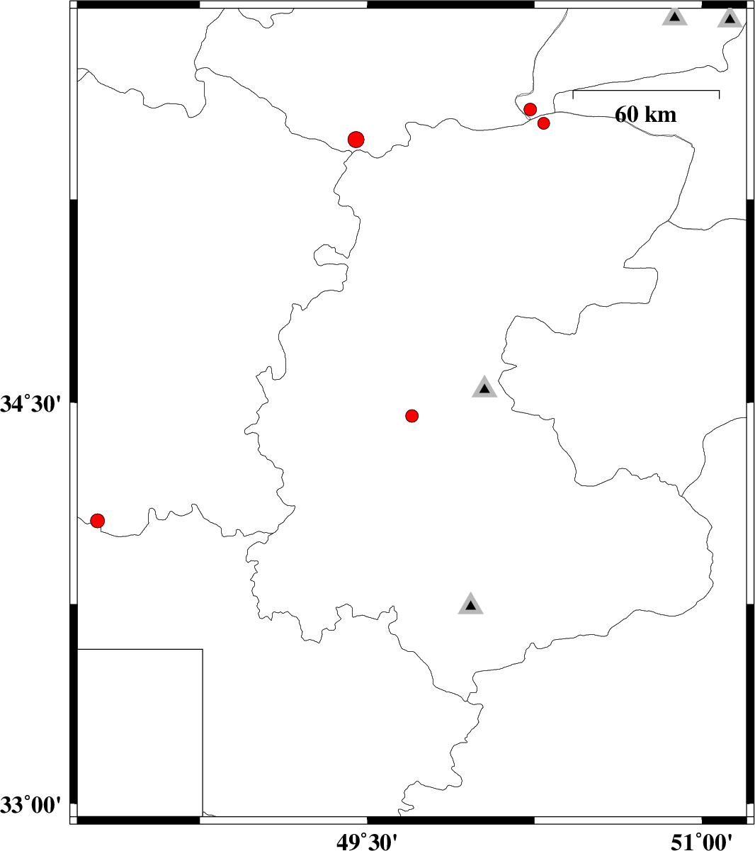 | 2012/03/22 | 17:46:15.3 | 22:16:15.3 | 34.45 | 49.7 | 12 | ML:2.6 | Markazi Province, 40 km North of Arak | ||