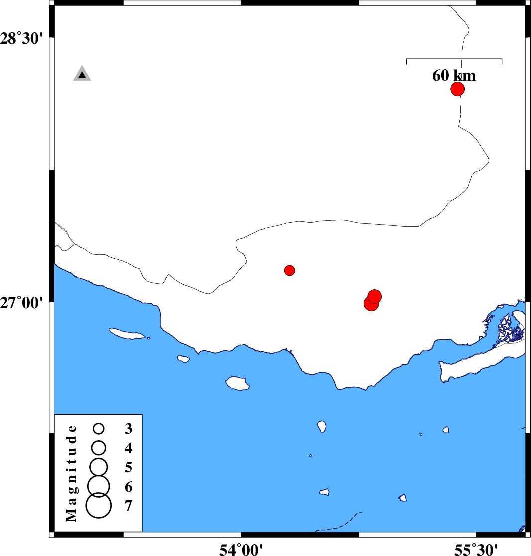 | 2012/03/12 | 05:09:52.6 | 08:39:52.6 | 26.99 | 54.83 | 15 | ML:4.2 | Hormozgan Province, 52 km North of Bandar-e lengeh | ||