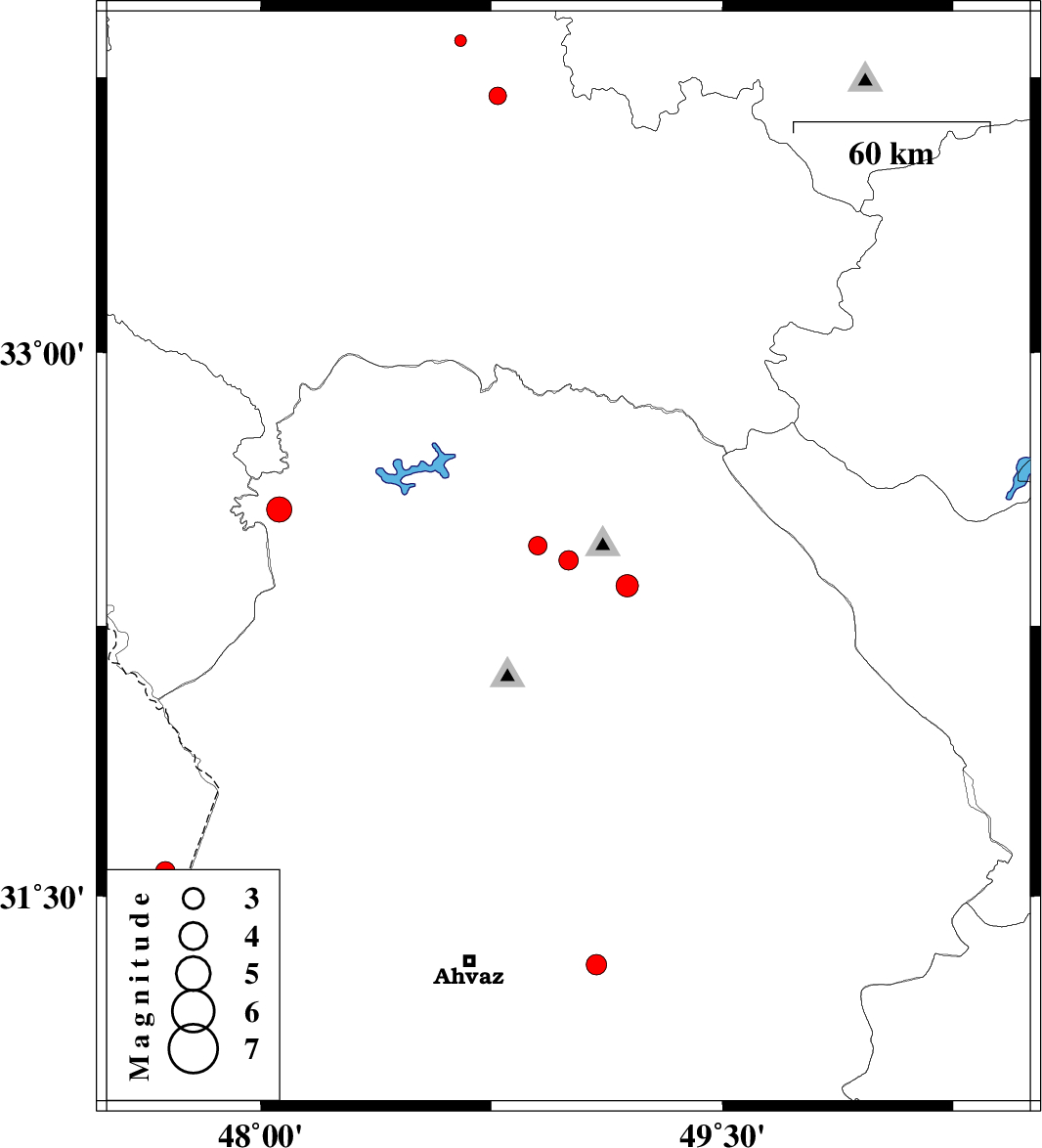 | 2012/03/22 | 06:00:19.8 | 10:30:19.8 | 32.57 | 48.06 | 43 | ML:3.6 | Khoozestan Province, 30 km North-West of Andimeshk | ||