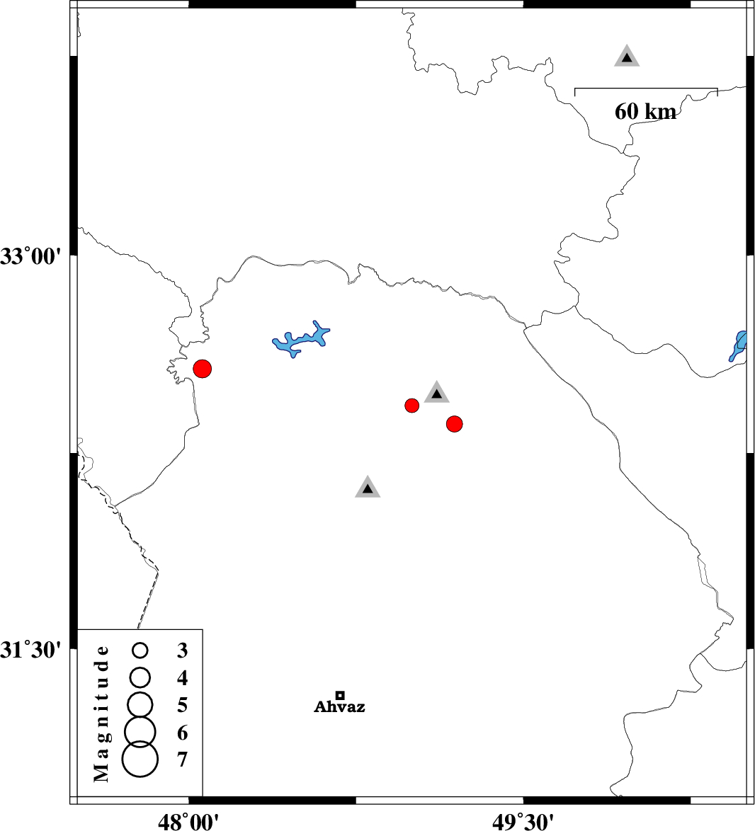 | 2012/03/22 | 06:00:19.8 | 10:30:19.8 | 32.57 | 48.06 | 43 | ML:3.6 | Khoozestan Province, 30 km North-West of Andimeshk | ||